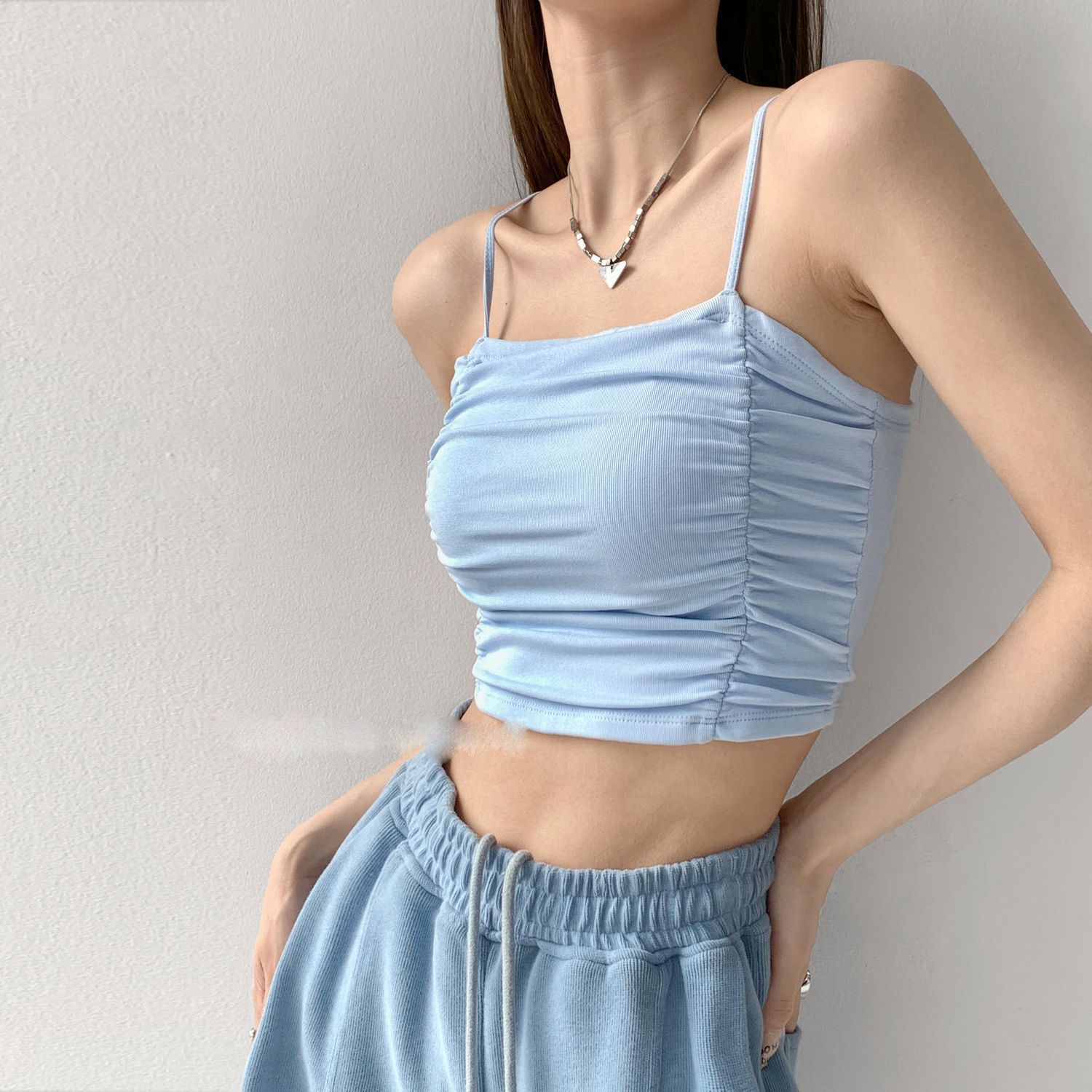 纯欲褶皱小吊带背心女夏季短款辣妹修身露脐纯色上衣