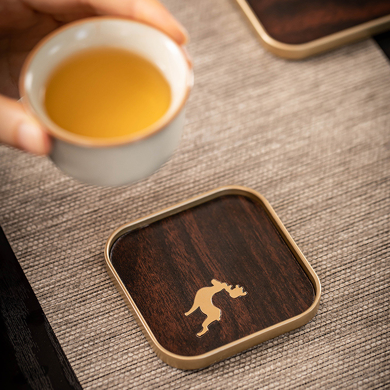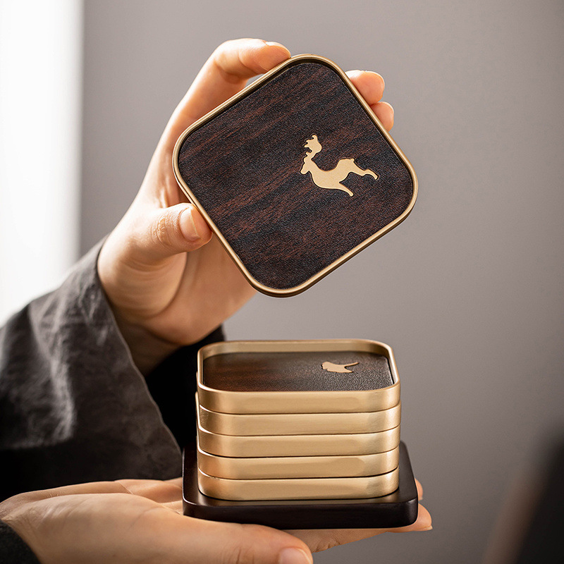 黑檀色杯垫六片装方形镶铜三图案垫托