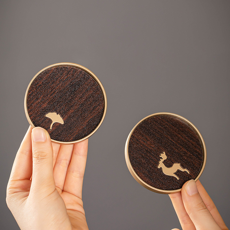 黑檀色杯垫六片装圆形镶铜三图案垫托