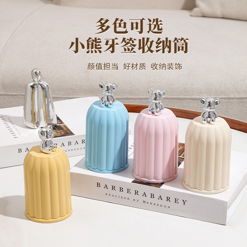 轻奢牙签盒家用高颜值创意小熊牙签筒罐大容量带盖牙签棉签收纳盒