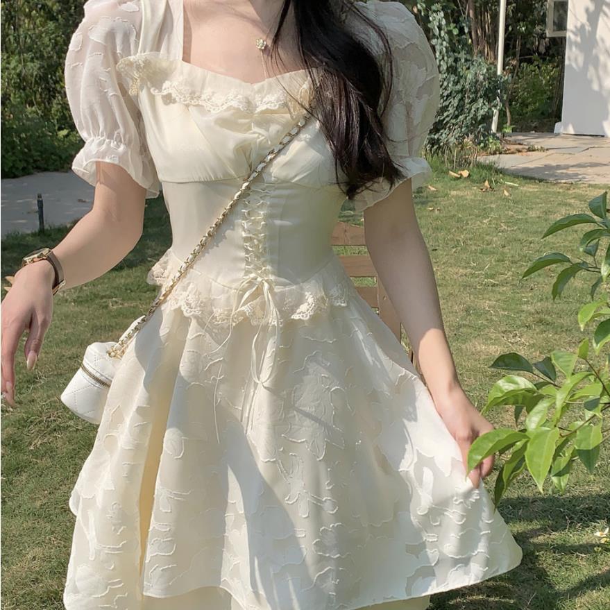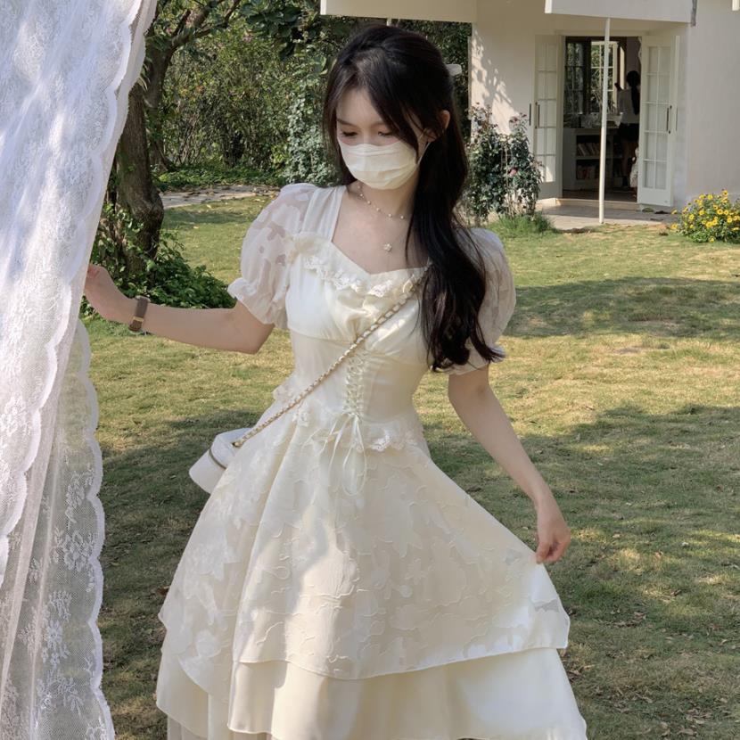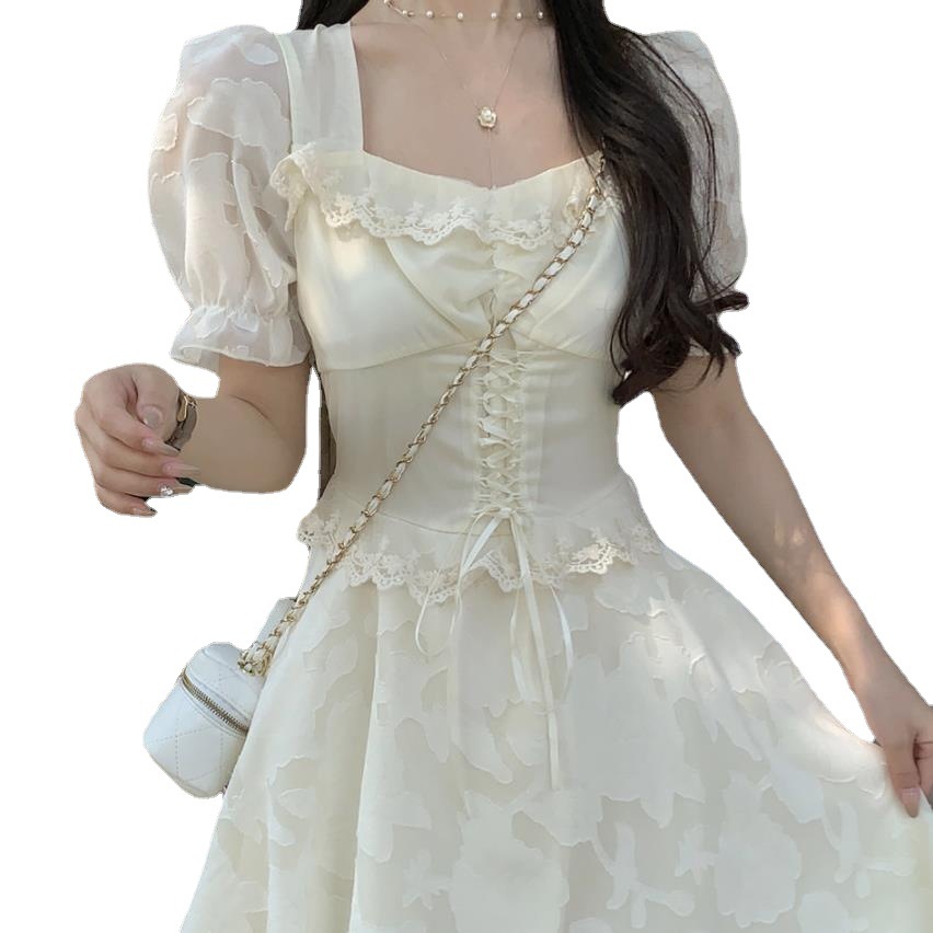 法式名媛风方领短袖连衣裙女夏季新款收腰显瘦设计感公主裙子