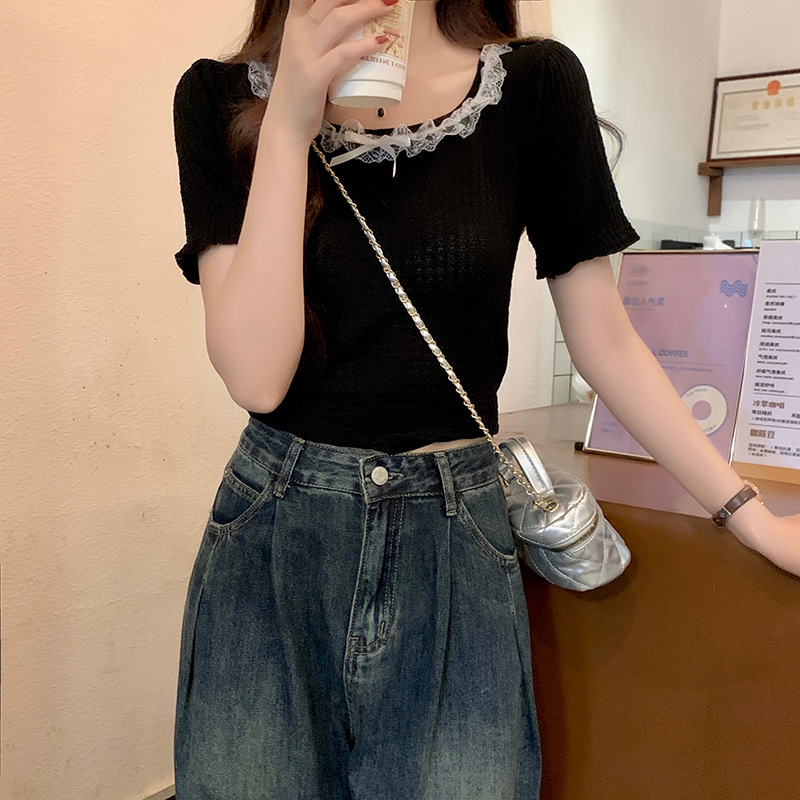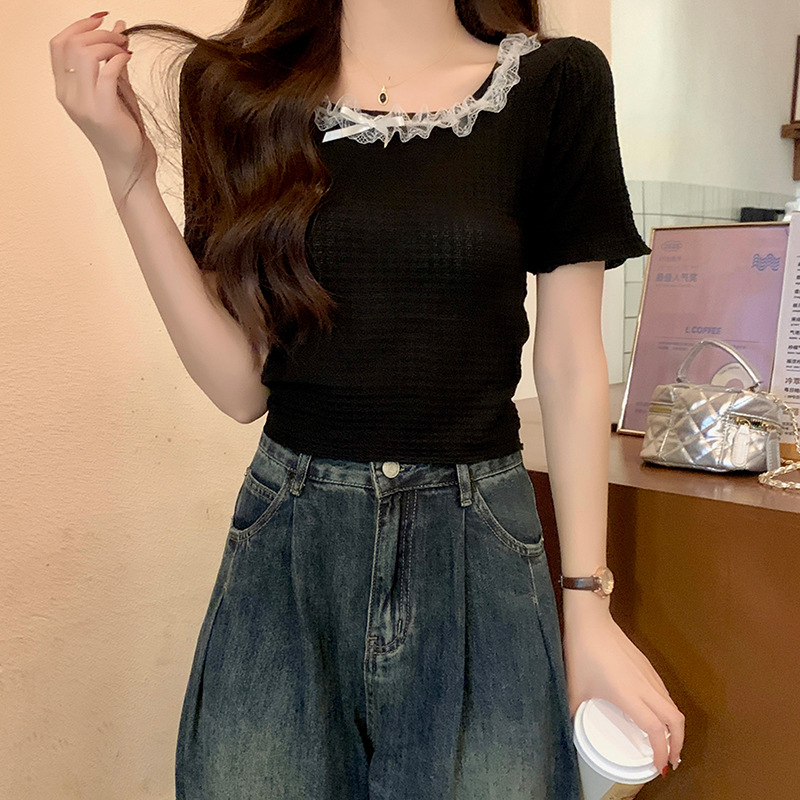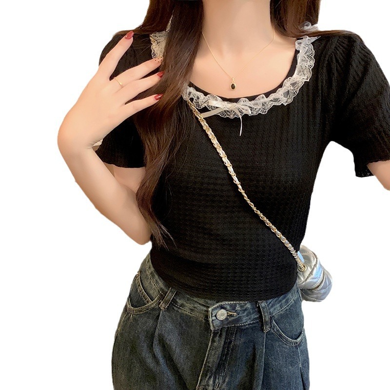 夏季撞色蕾丝边方领短袖t恤修身显瘦泡泡袖百搭短款减龄洋气小衫