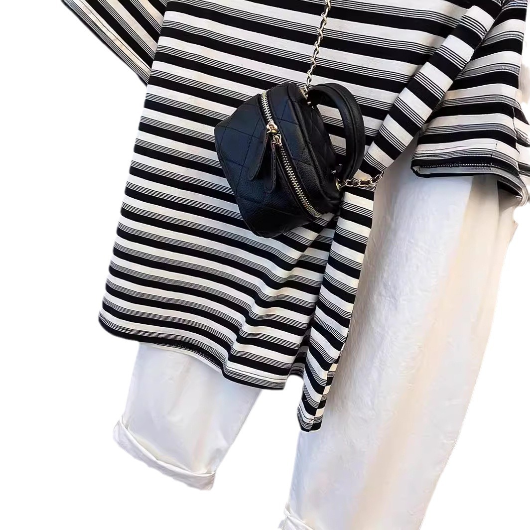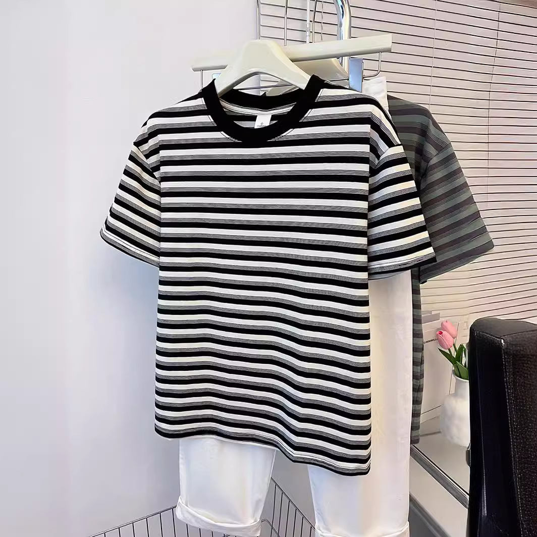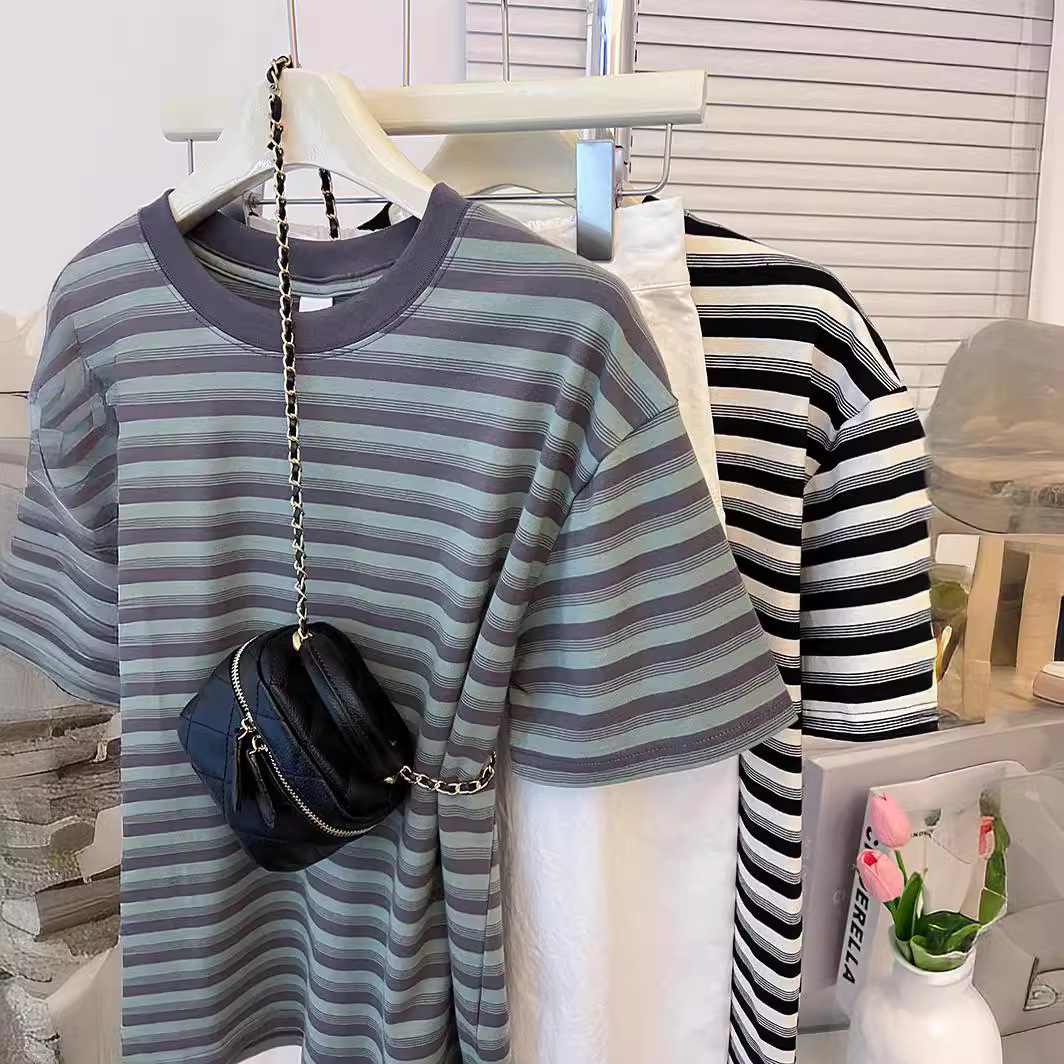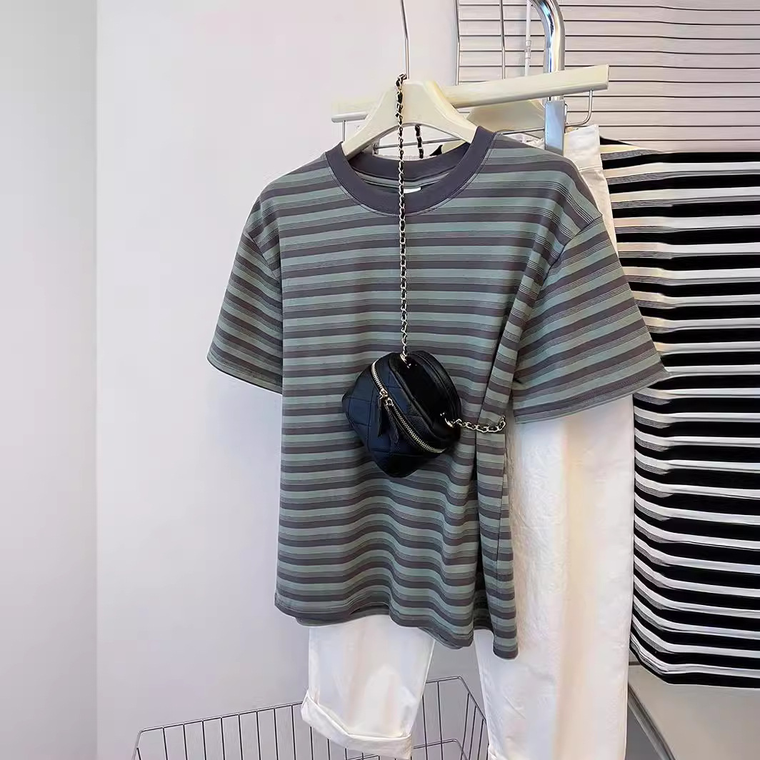 夏季韩版百搭经典条纹修身撞色设计感短袖T恤女上衣显瘦半袖