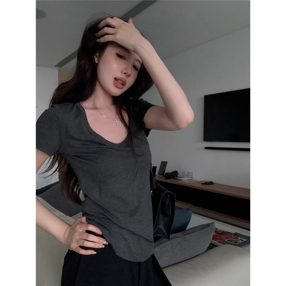 正肩收腰修身打底衫t恤女大码胖妹妹纯欲复古显瘦辣妹短袖小上衣
