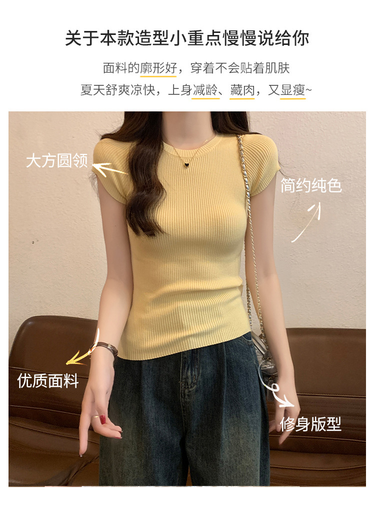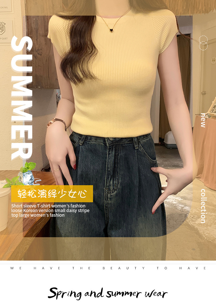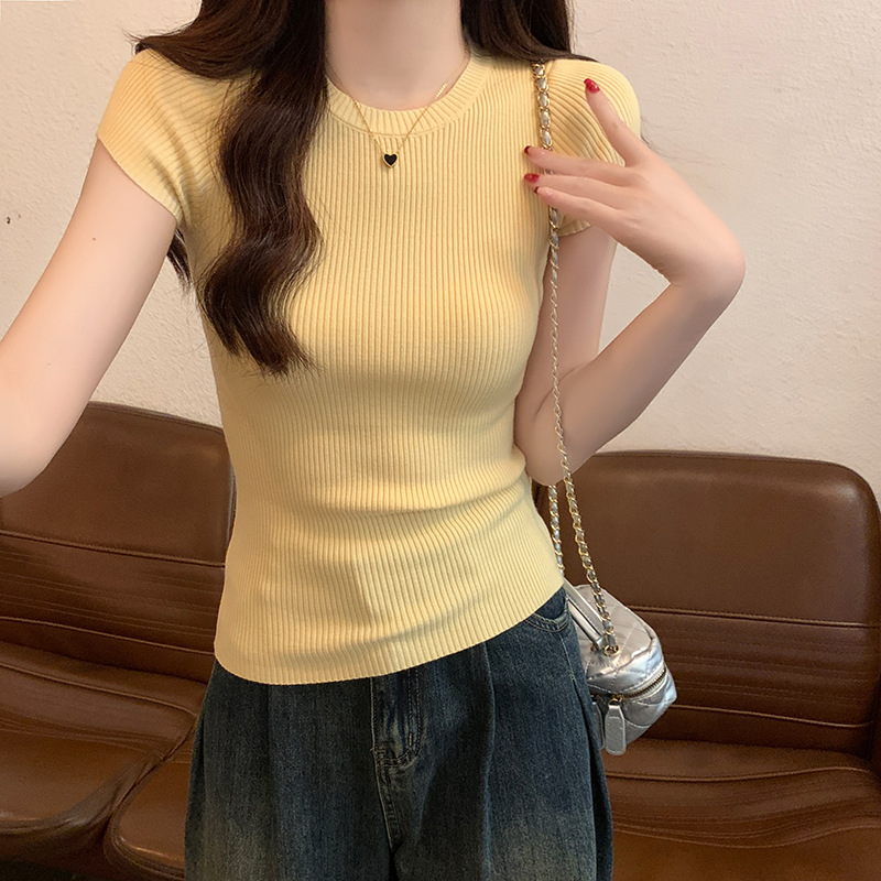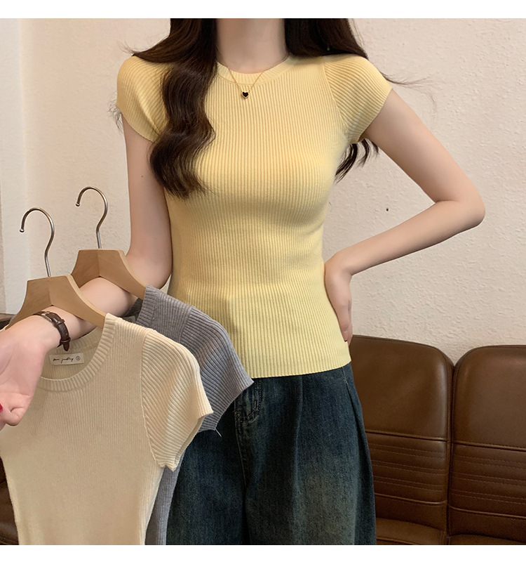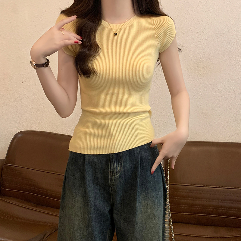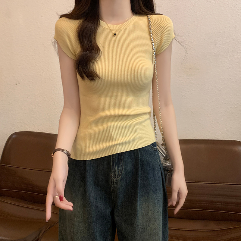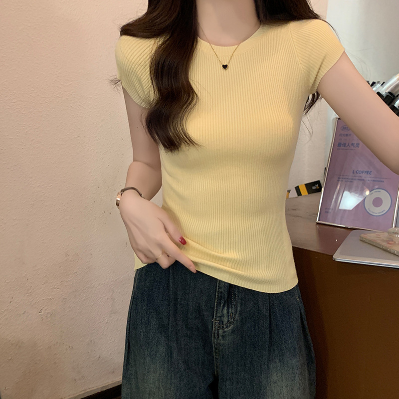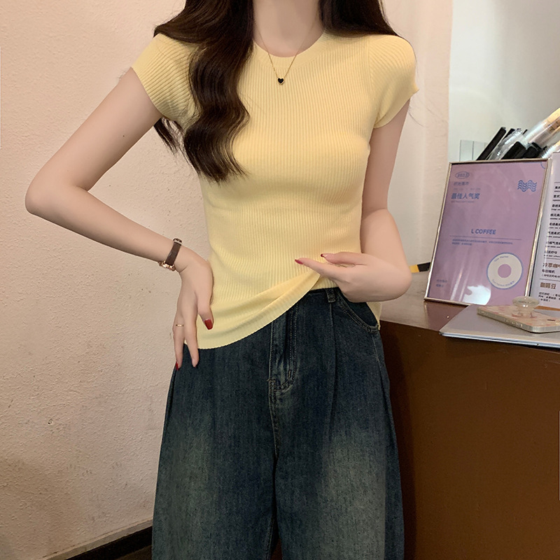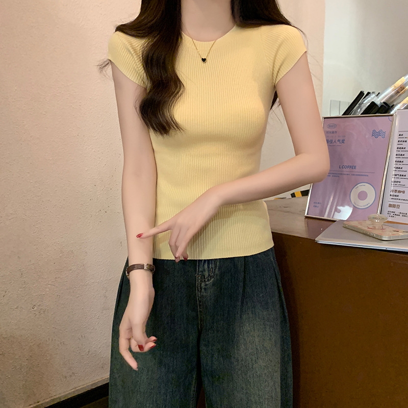 黄色短袖针织t恤女夏季新款爆款小飞袖修身正肩短款早春上衣