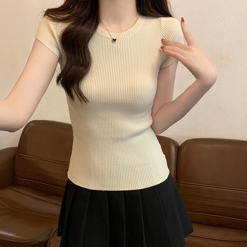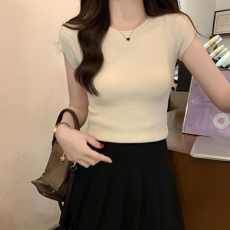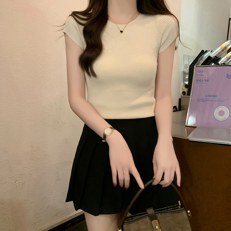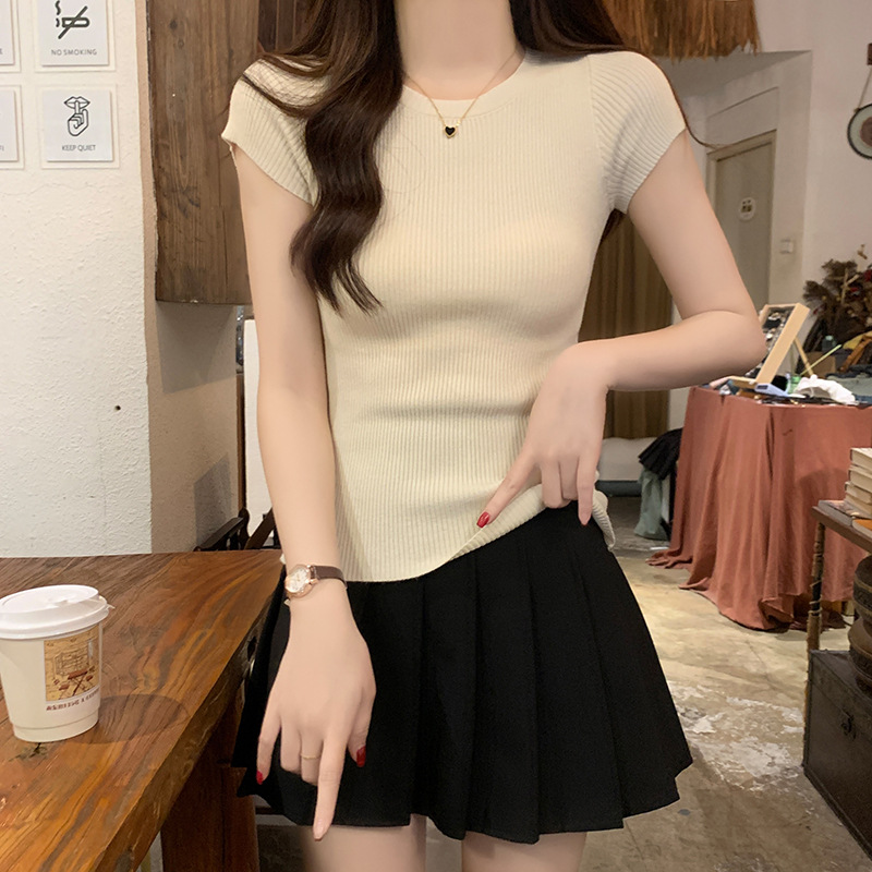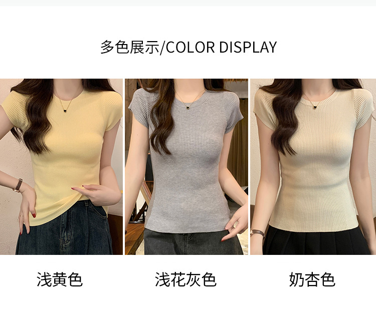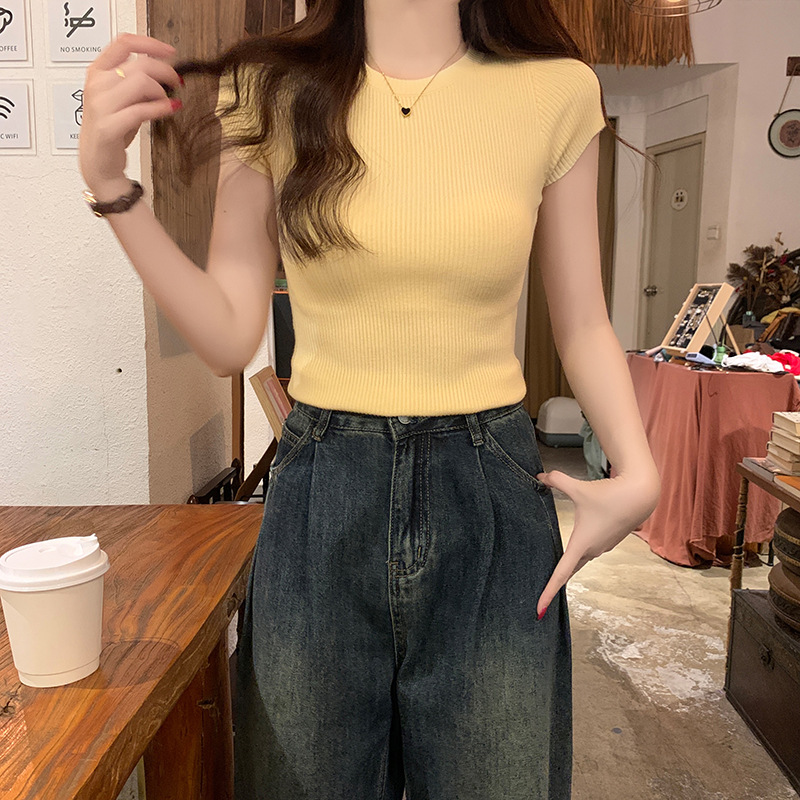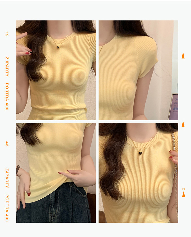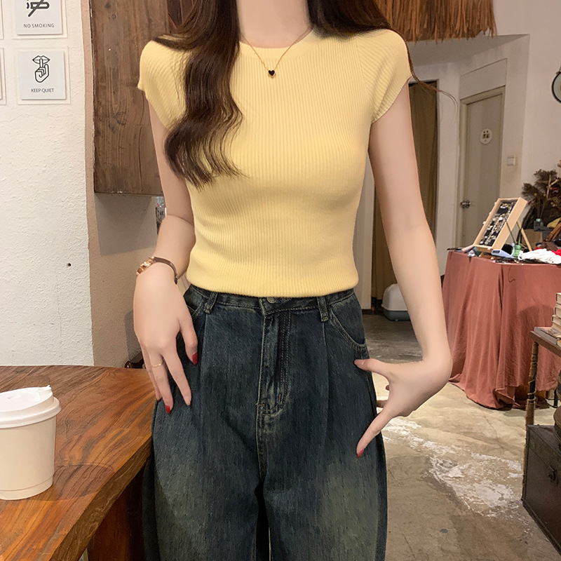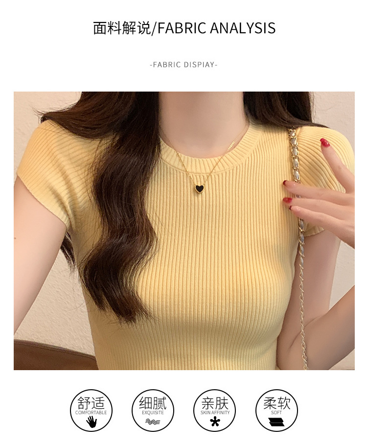 黄色短袖针织t恤女夏季新款爆款小飞袖修身正肩短款早春上衣