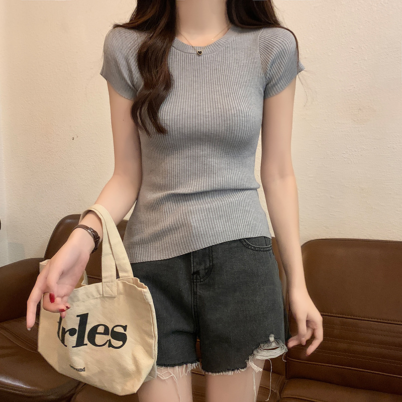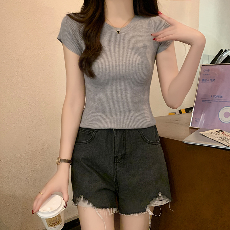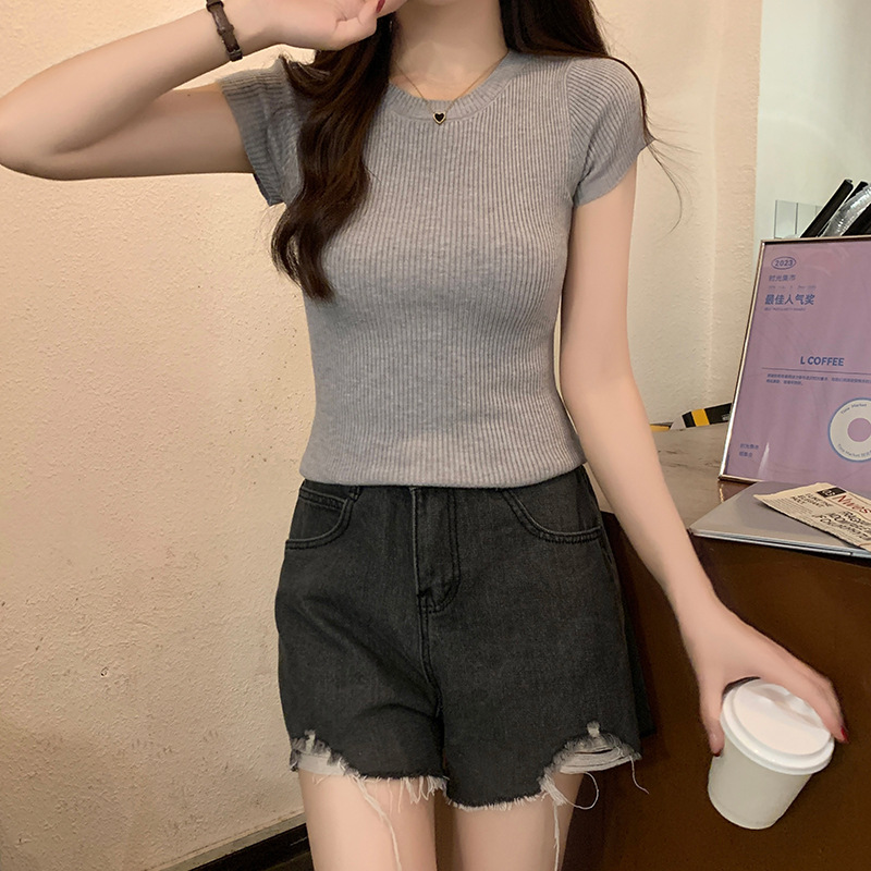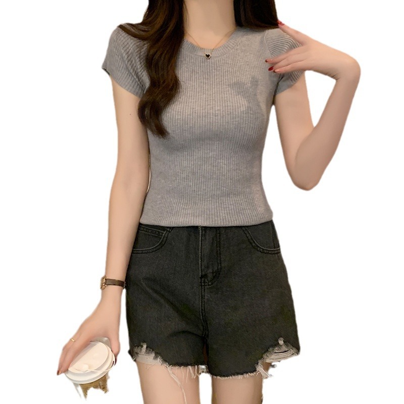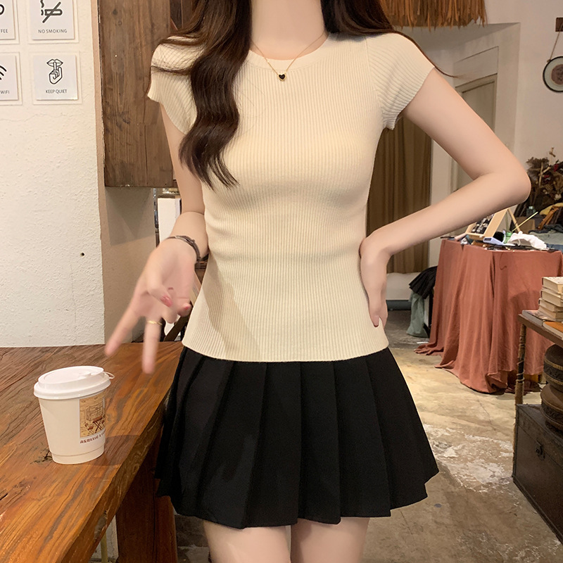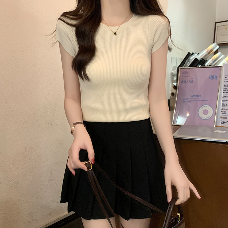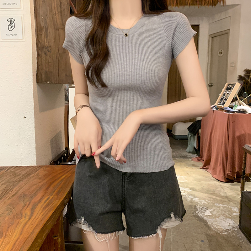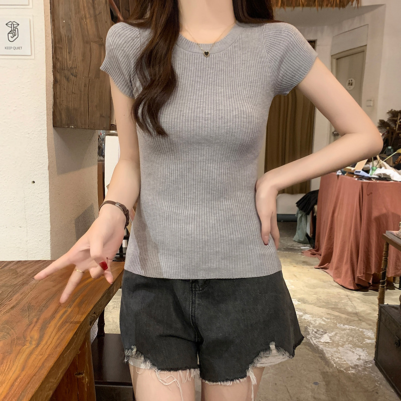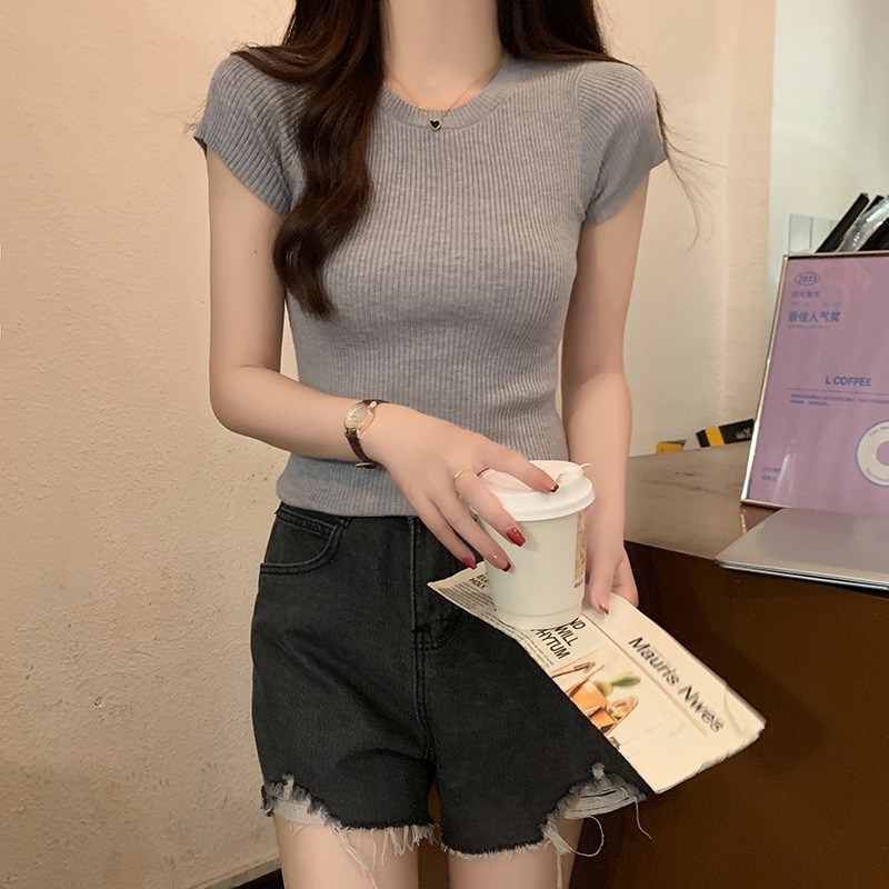 黄色短袖针织t恤女夏季新款爆款小飞袖修身正肩短款早春上衣