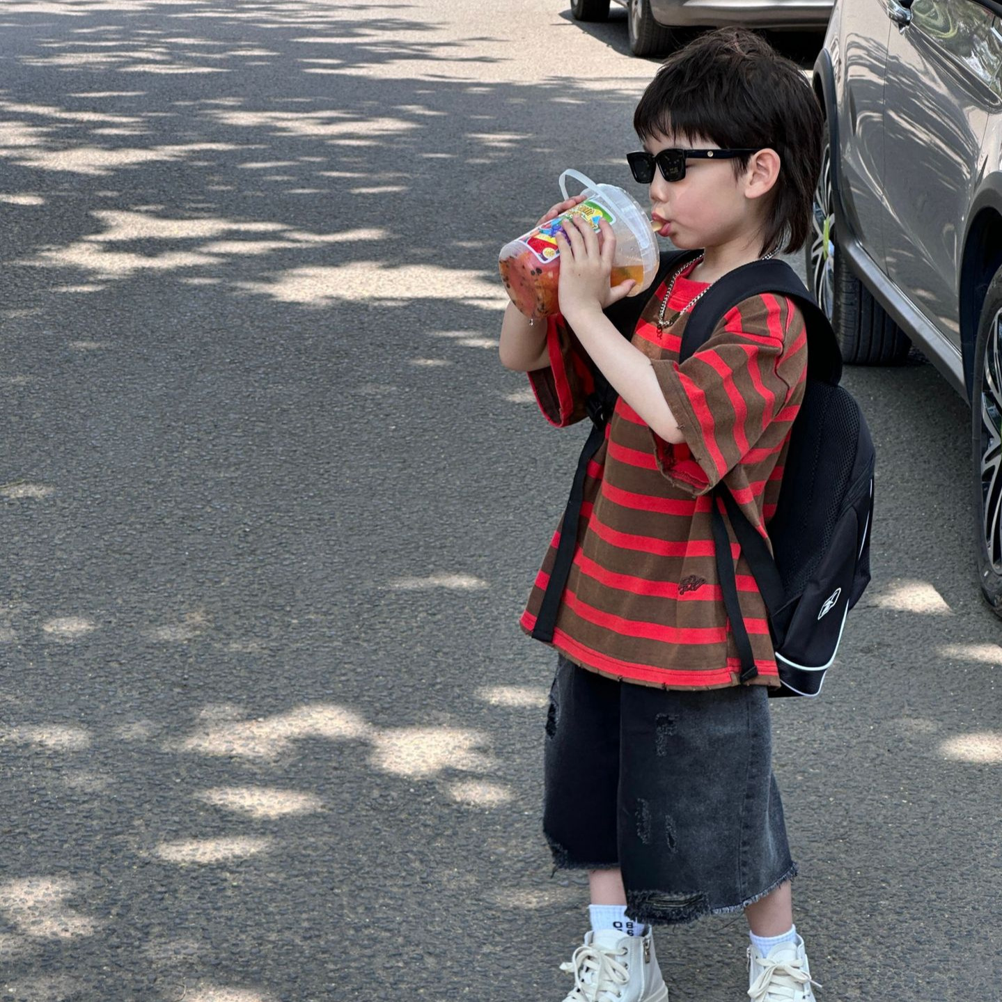 泰如夏季新款韩版男童条纹百搭设计感短袖儿童时尚T恤洋气潮