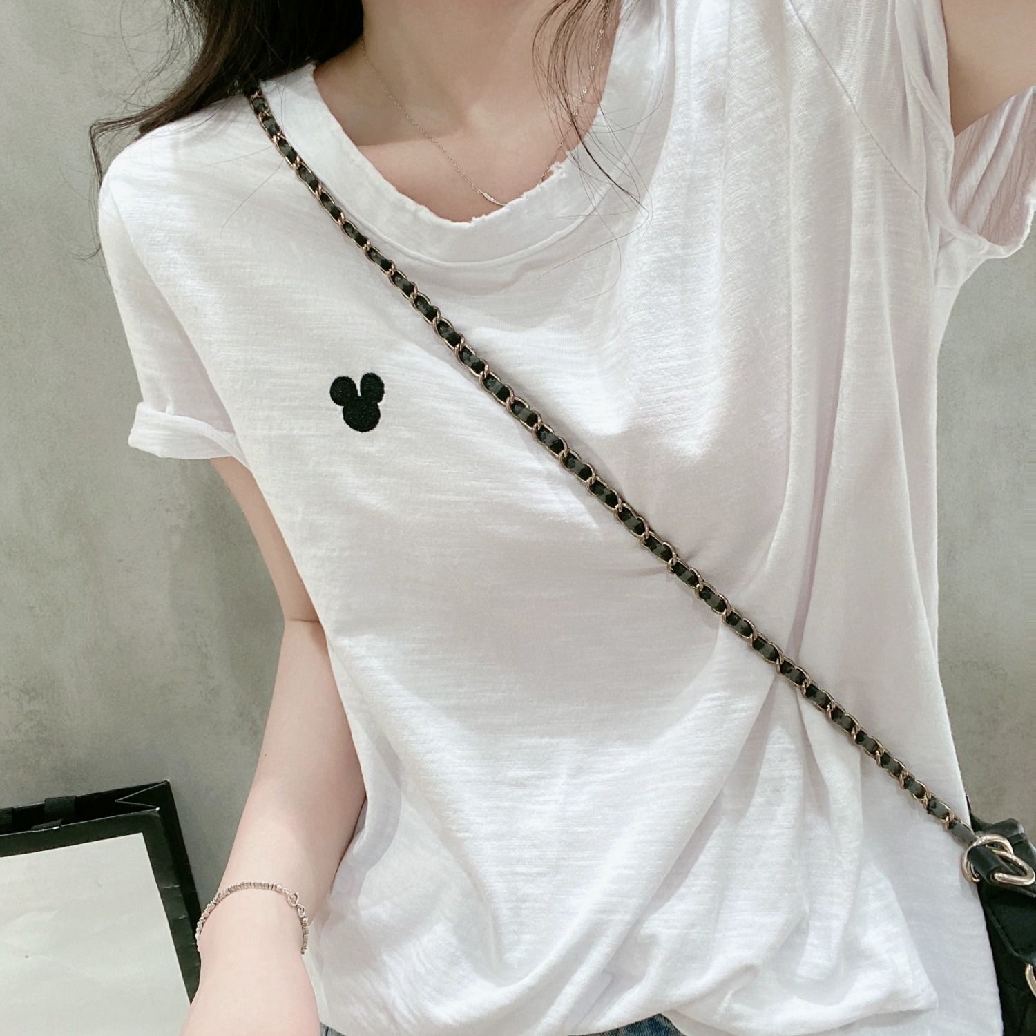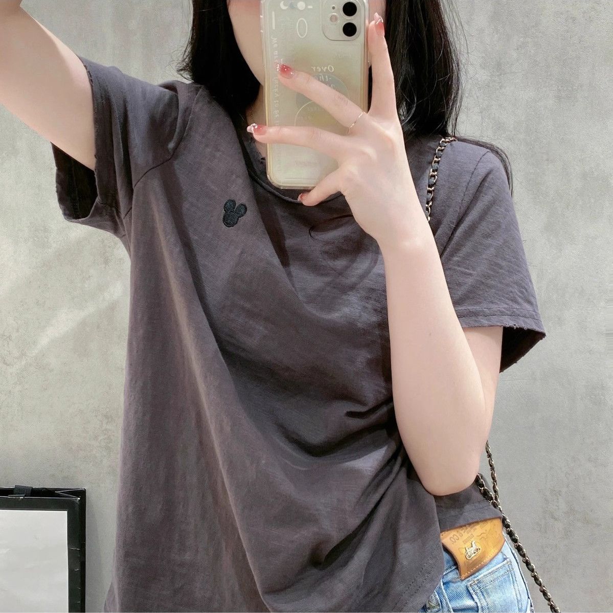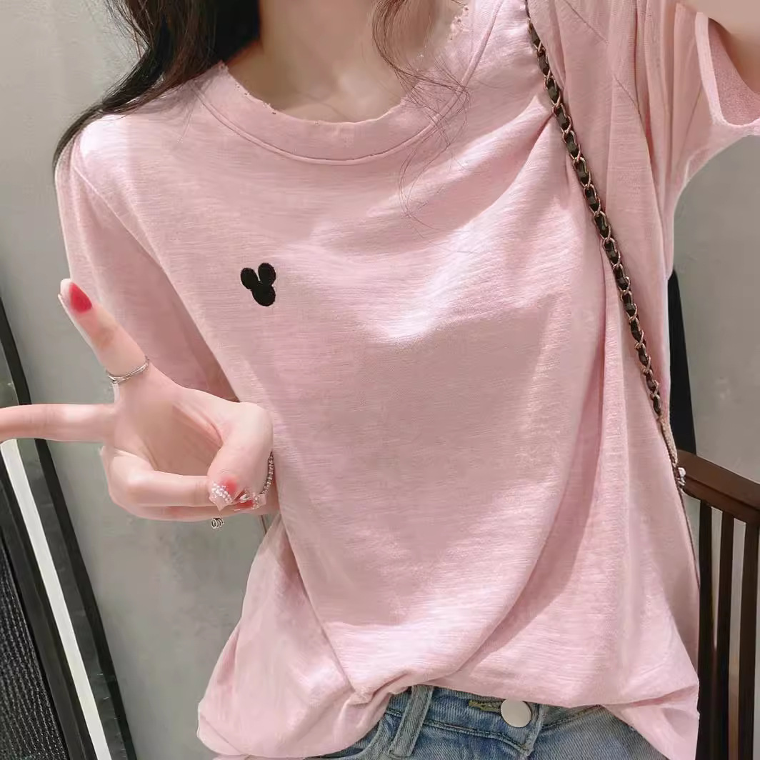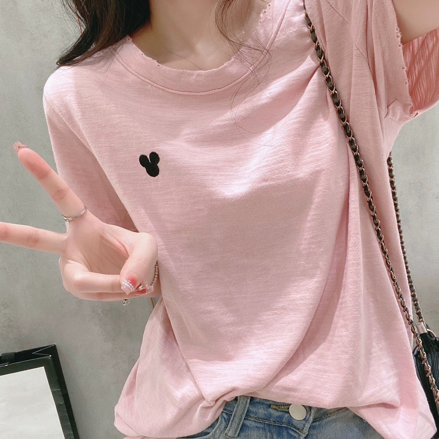 圆领刺绣竹节棉粉色短袖T恤女装夏天宽松显瘦正肩基础款上衣