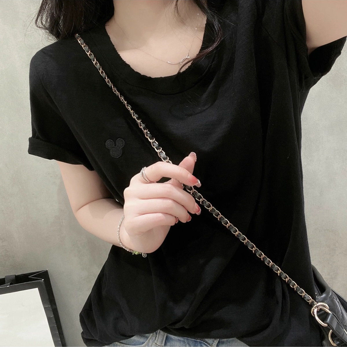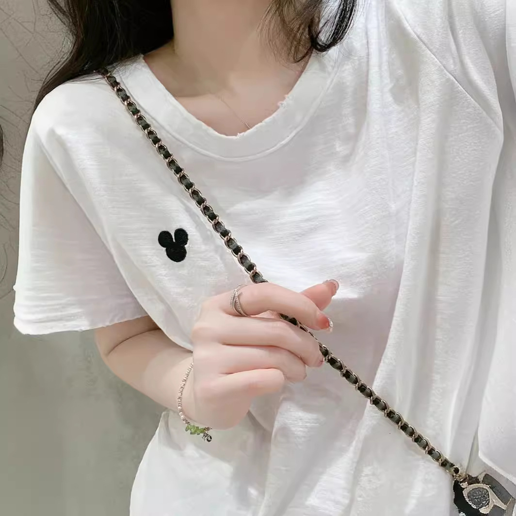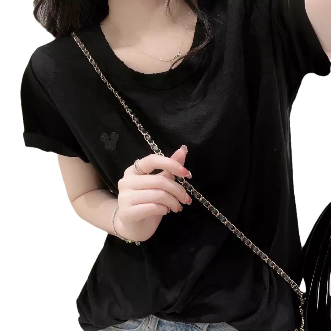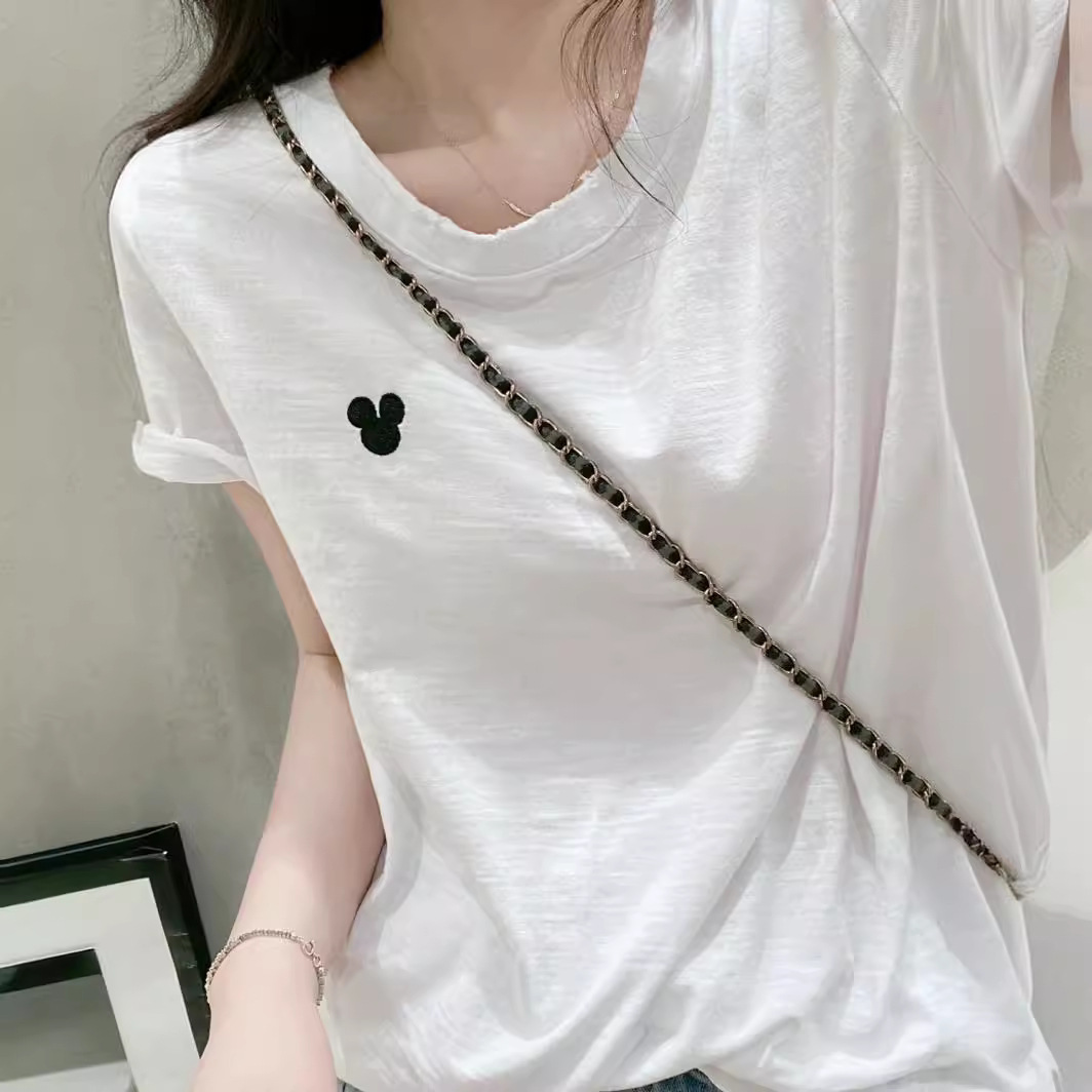 圆领刺绣竹节棉粉色短袖T恤女装夏天宽松显瘦正肩基础款上衣