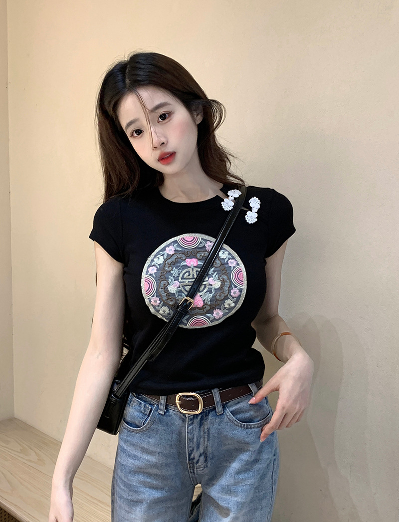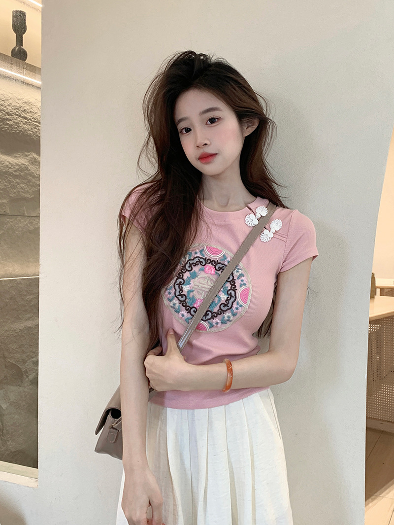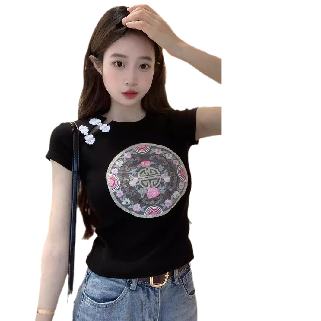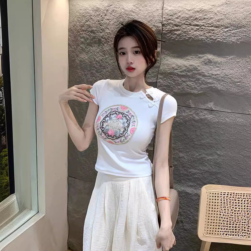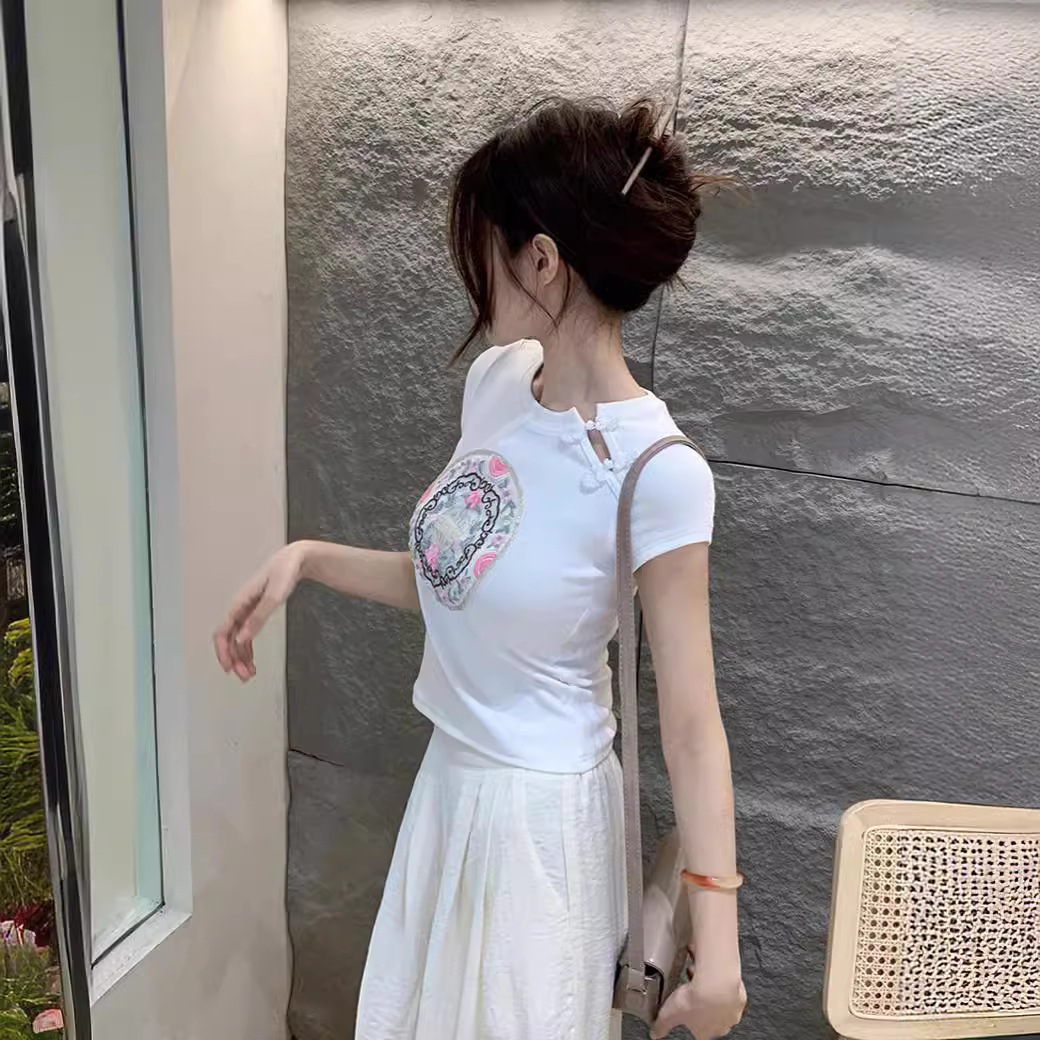 白色新中式国风刺绣正肩短袖T恤女夏季爆款甜辣紧身显瘦短款上衣