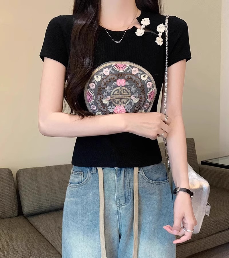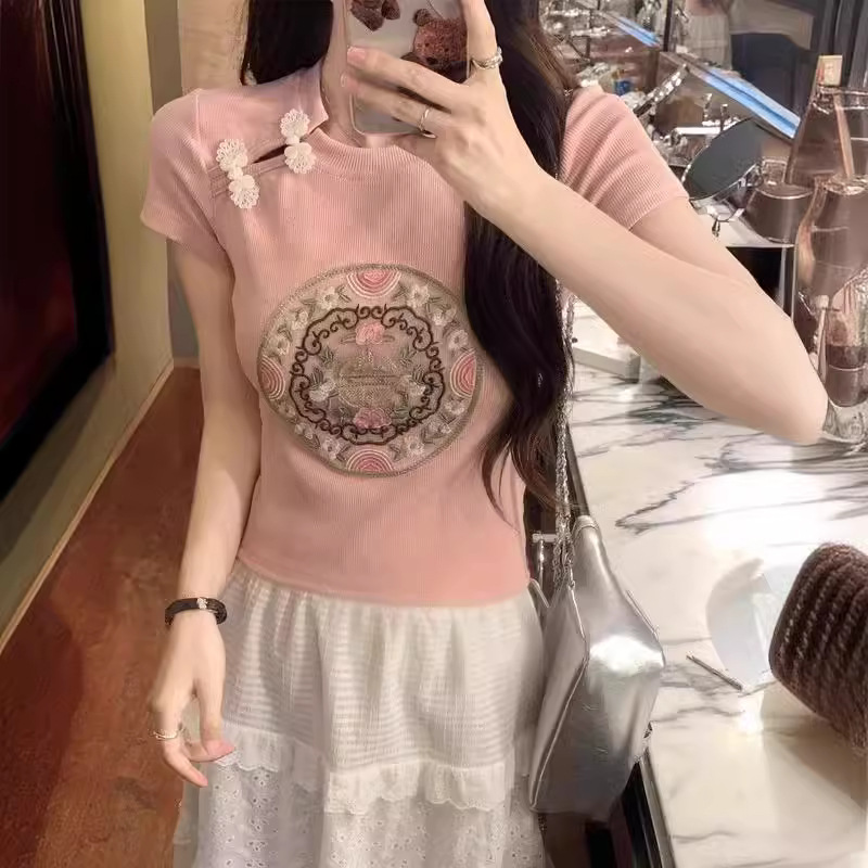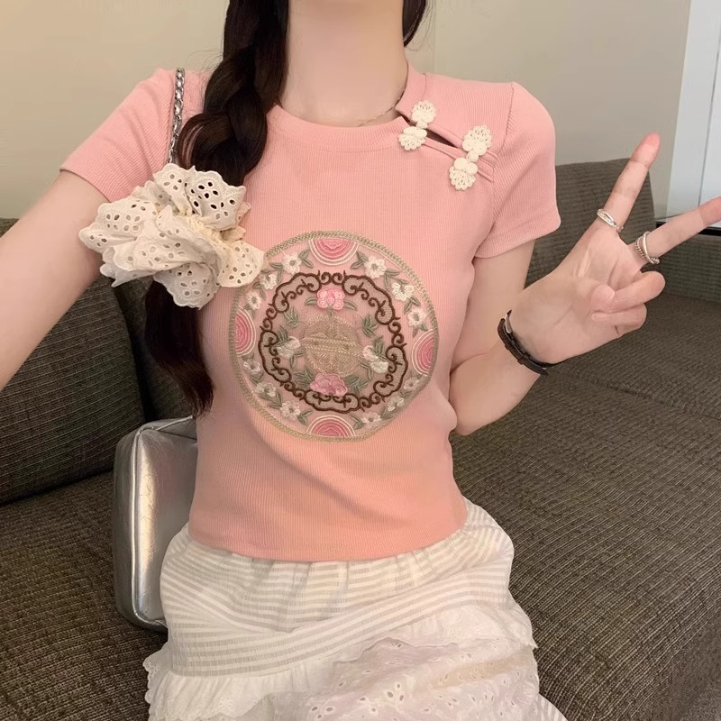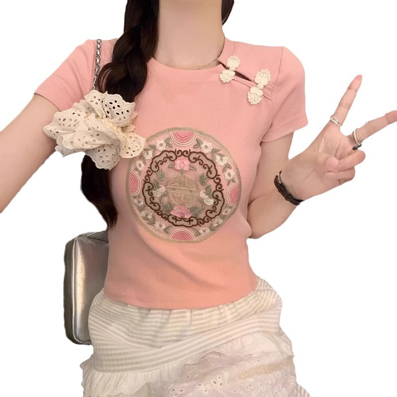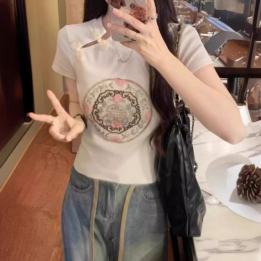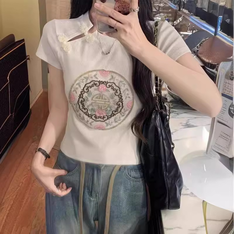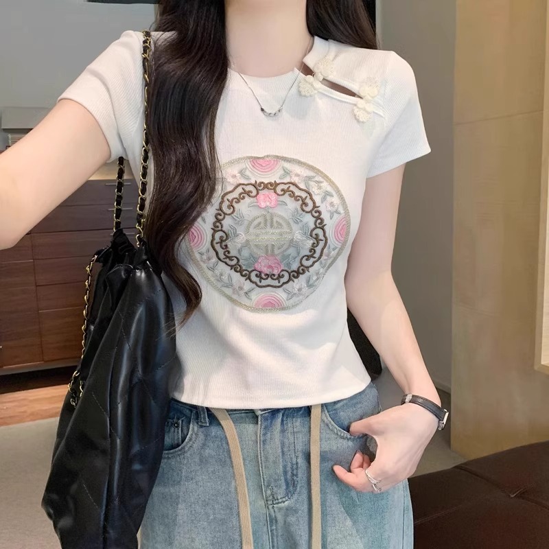 新款辣妹新中式国风旗袍盘扣刺绣短款白色上衣女小众修身短袖t恤