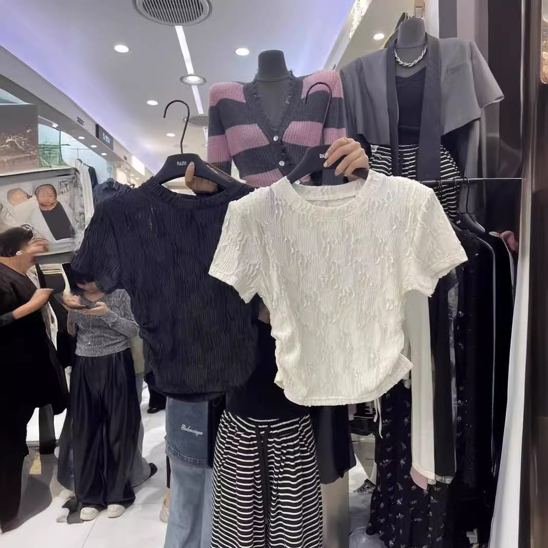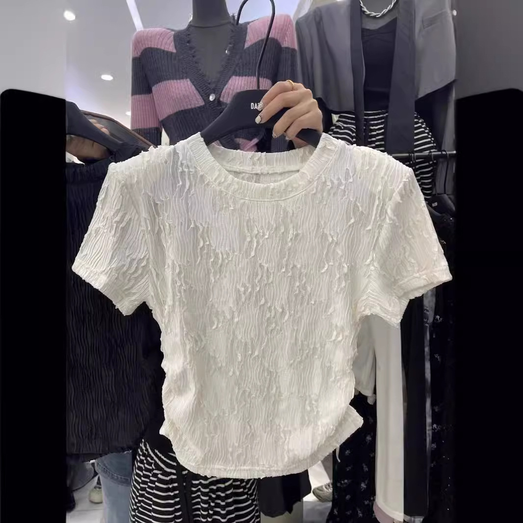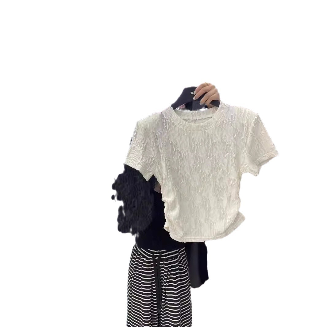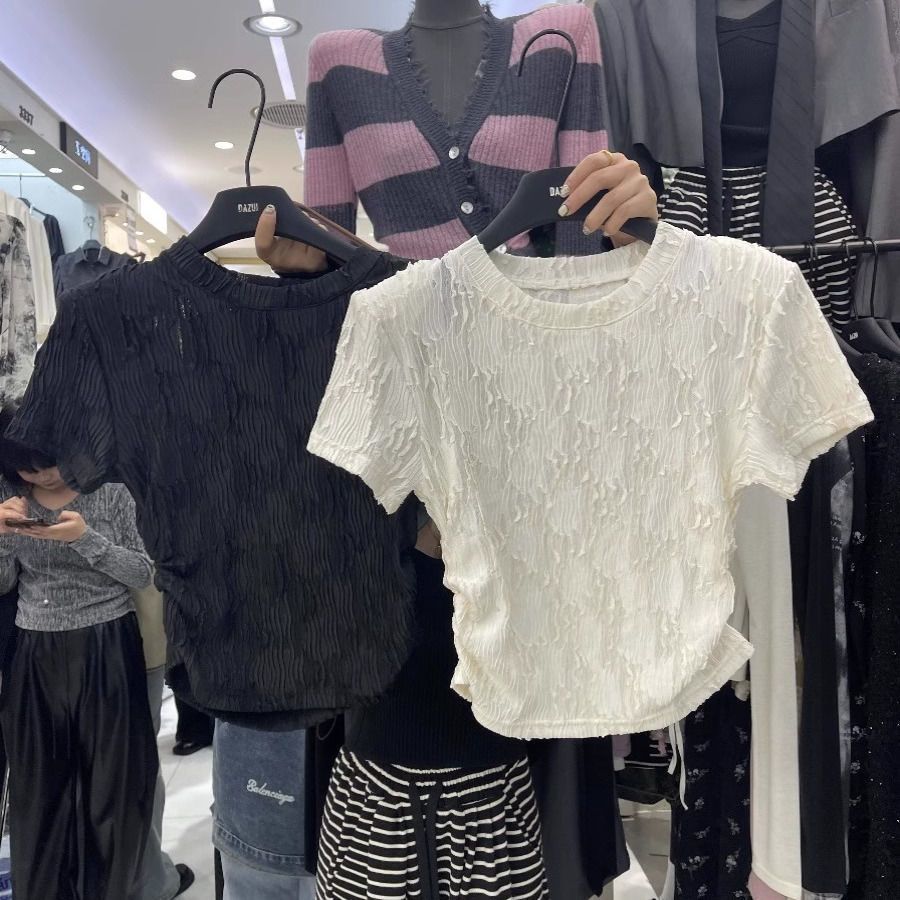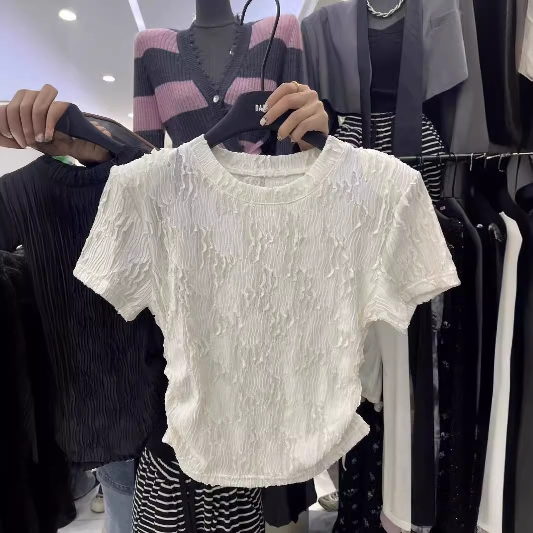 夏款新款圆领设计感褶皱修身短款简约风休闲百搭短袖T恤上衣
