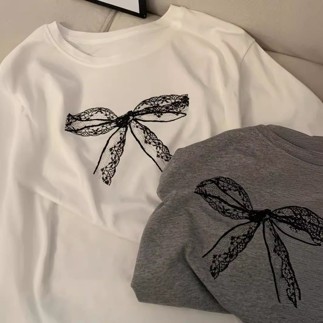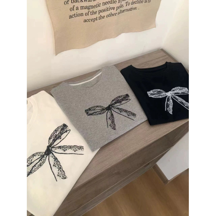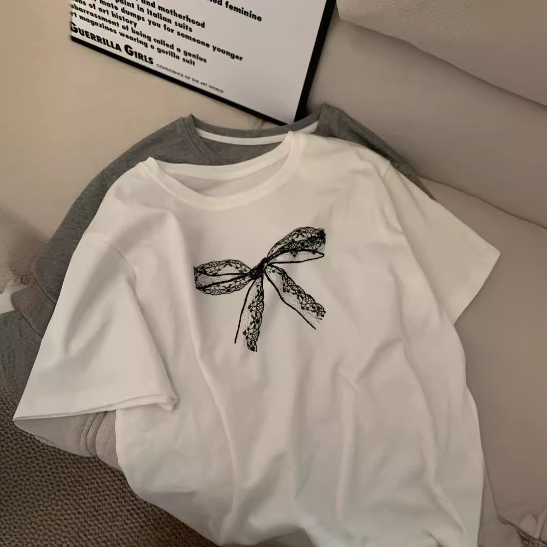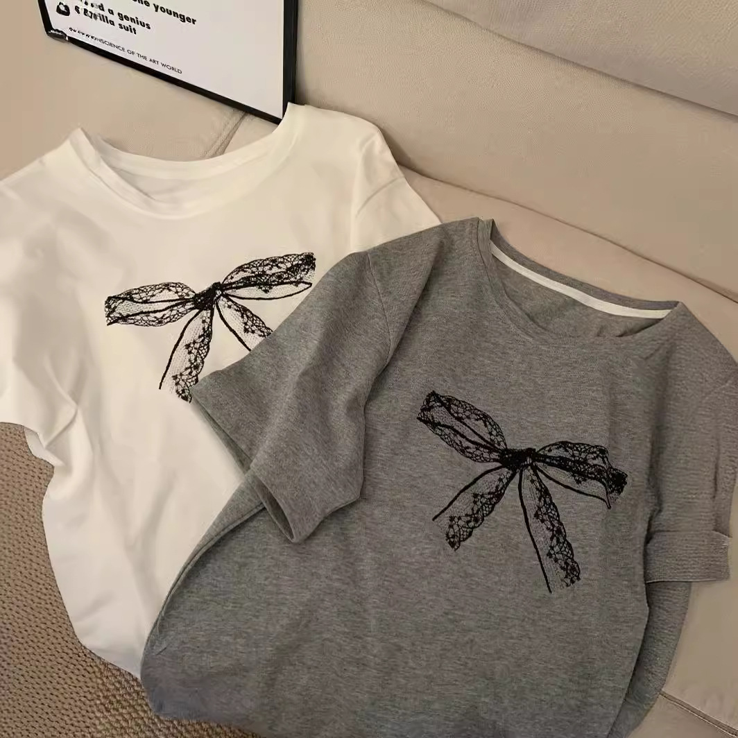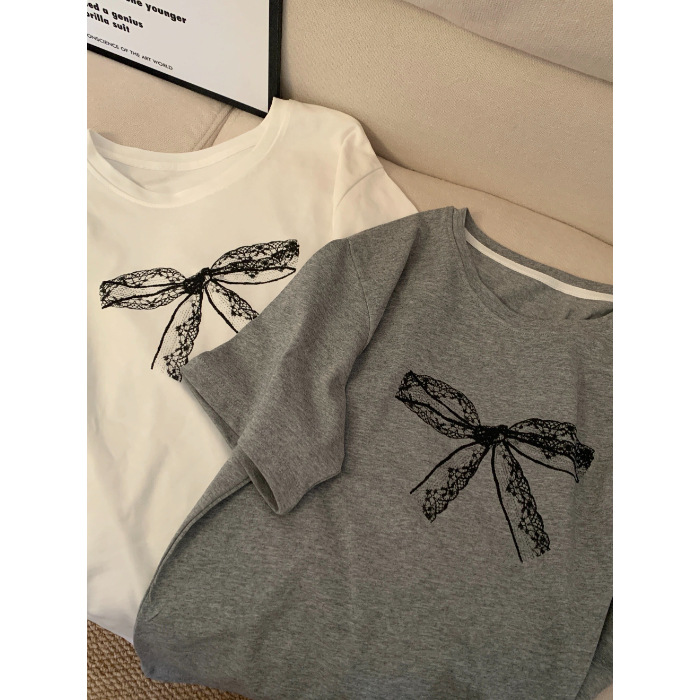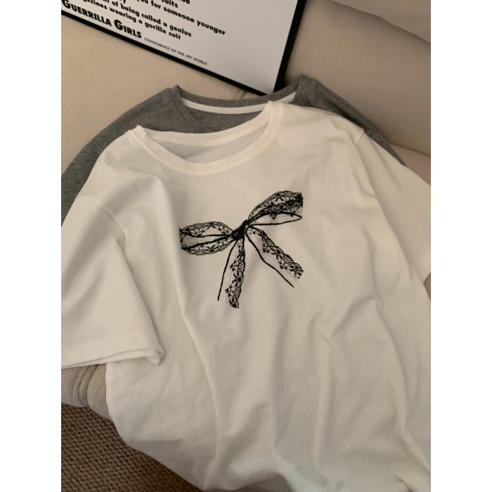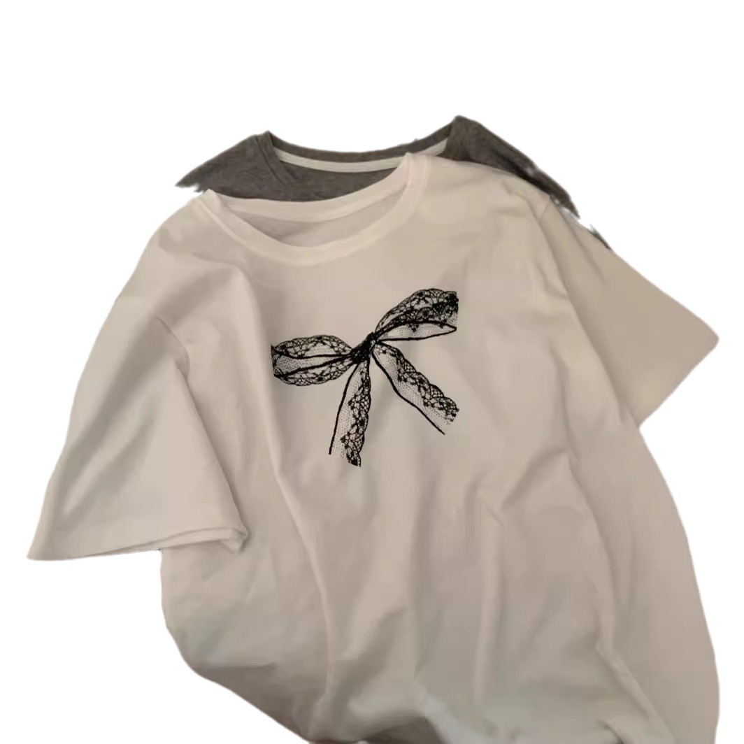 韩国蕾丝蝴蝶结印花短袖t恤女夏季新款洋气百搭小个子纯棉上衣潮