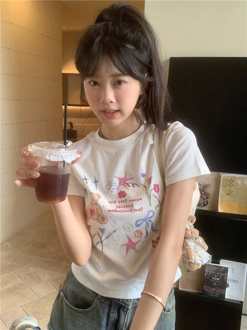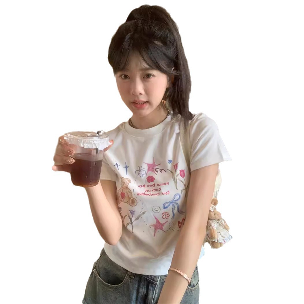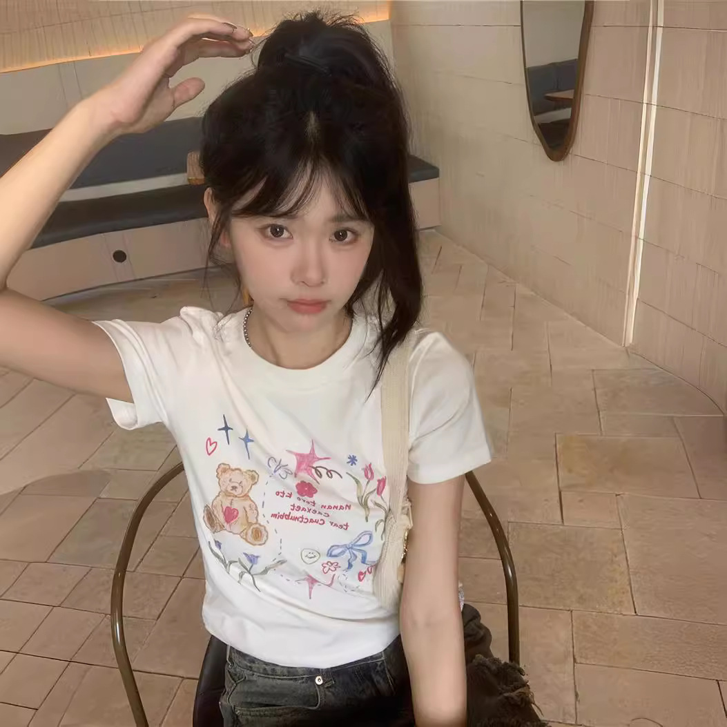 纯欲风辣妹趣味小熊印花短袖T恤女夏季新款修身百搭套头上衣