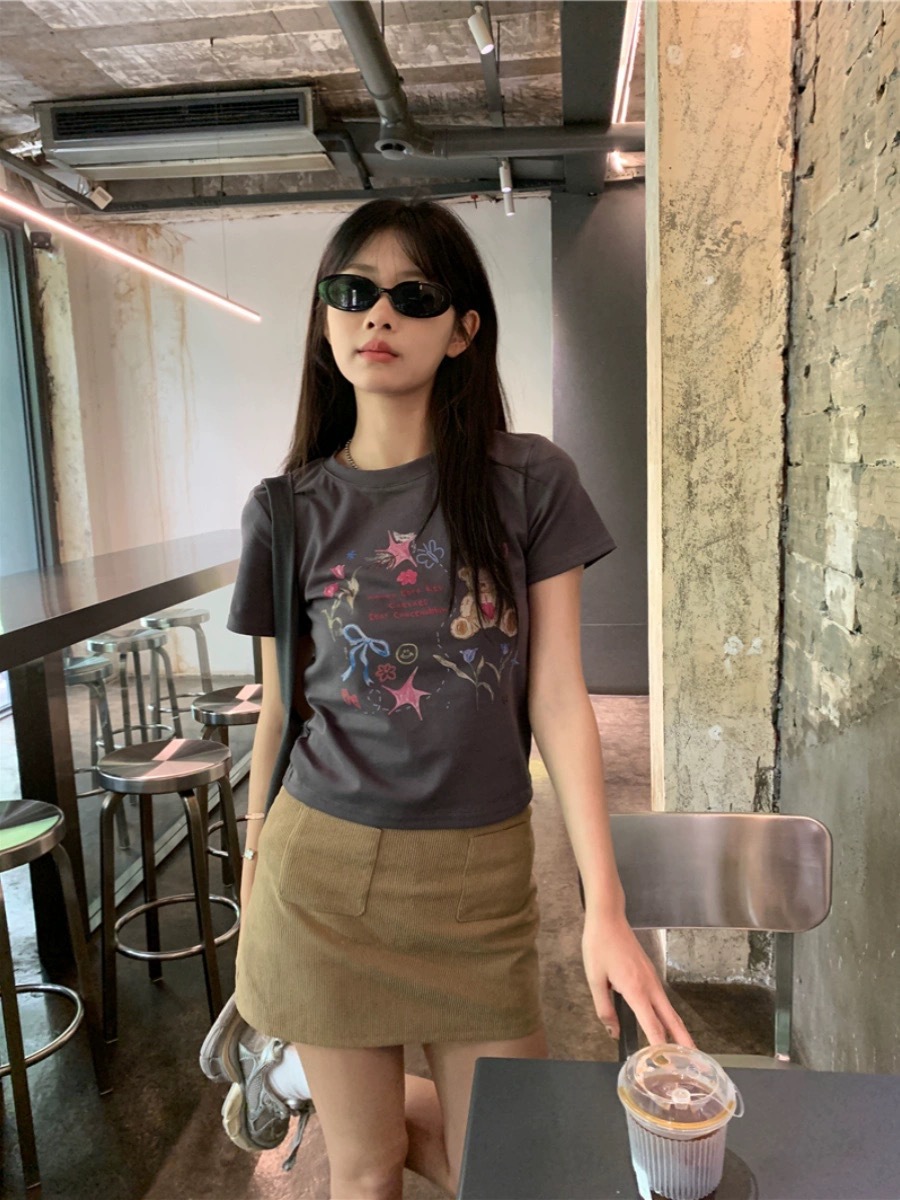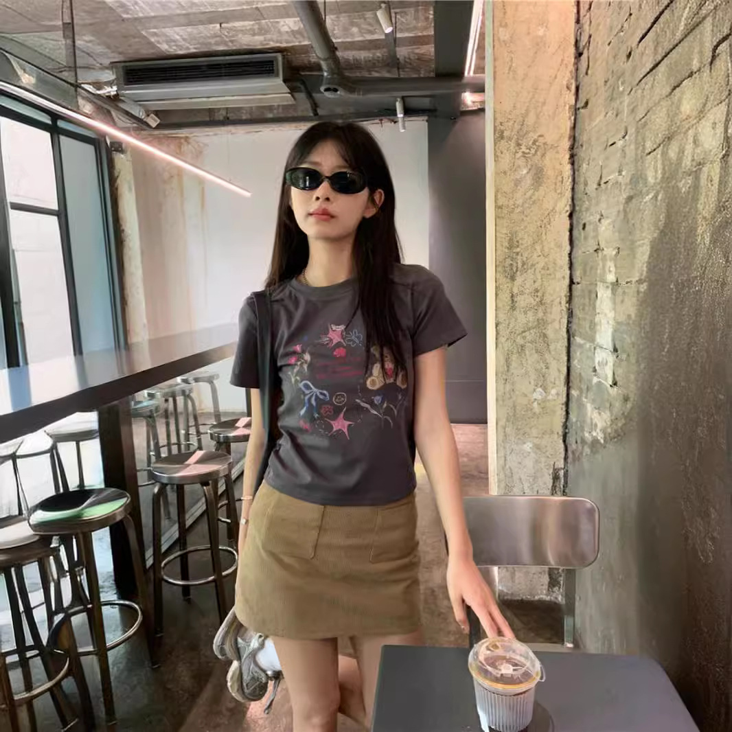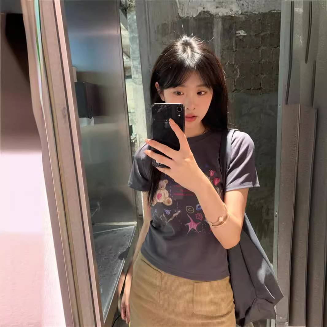 纯欲风辣妹趣味小熊印花短袖T恤女夏季新款修身百搭套头上衣