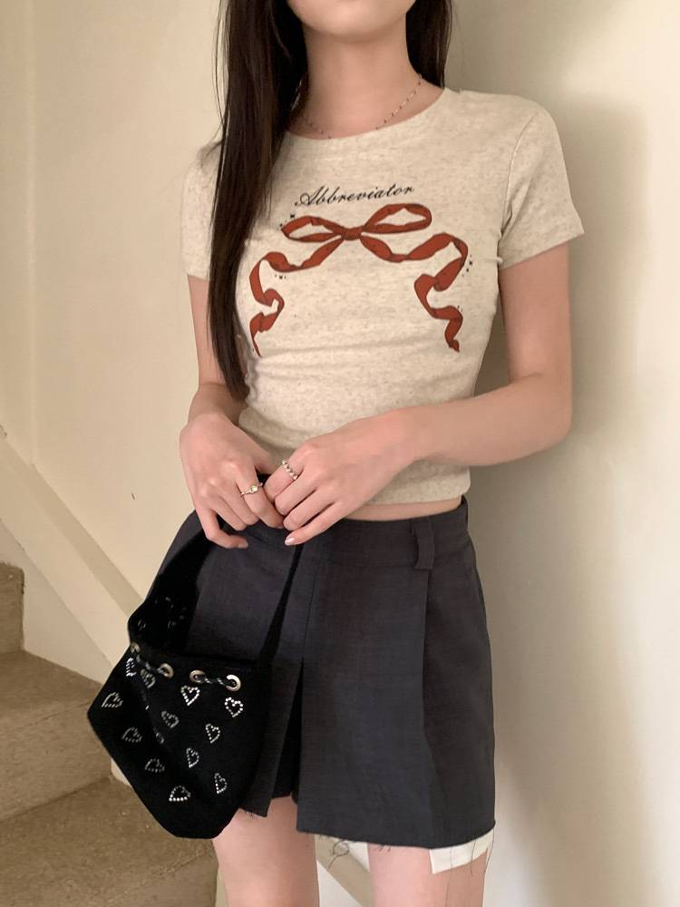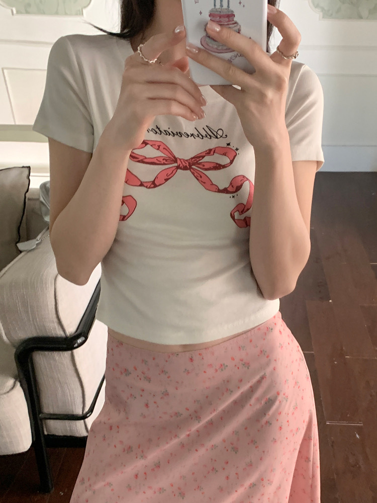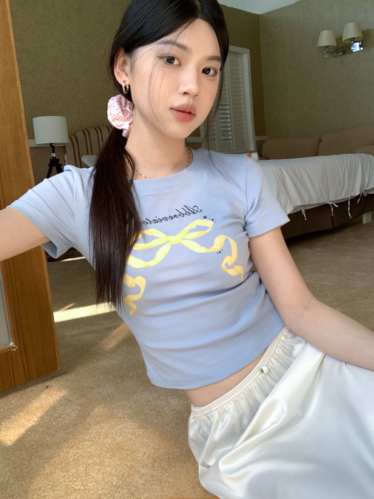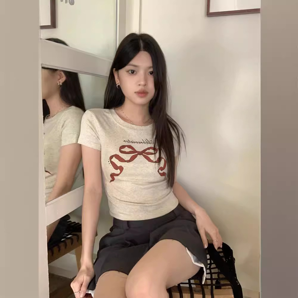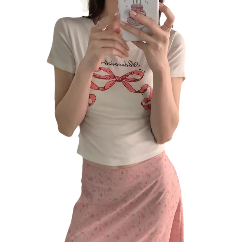 韩系甜辣风蝴蝶结印花T恤修身显瘦短袖内搭女春夏季圆领短款上衣