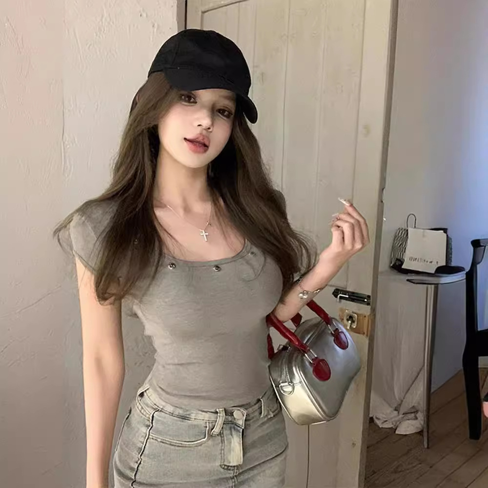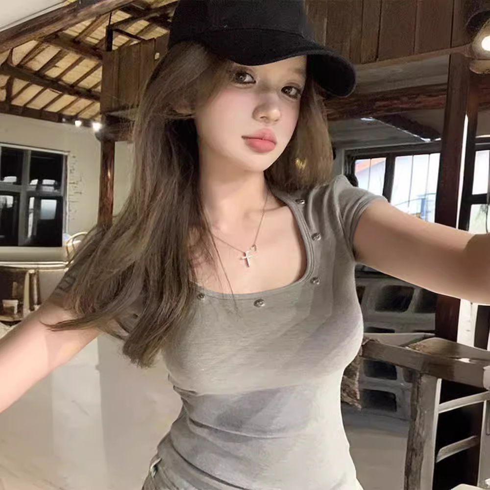 QIAOFUDUO纽扣装饰u领短袖正肩T恤女夏季设计感辣妹紧身短款上衣