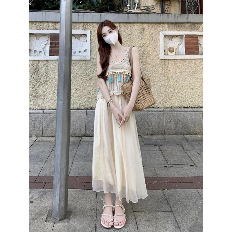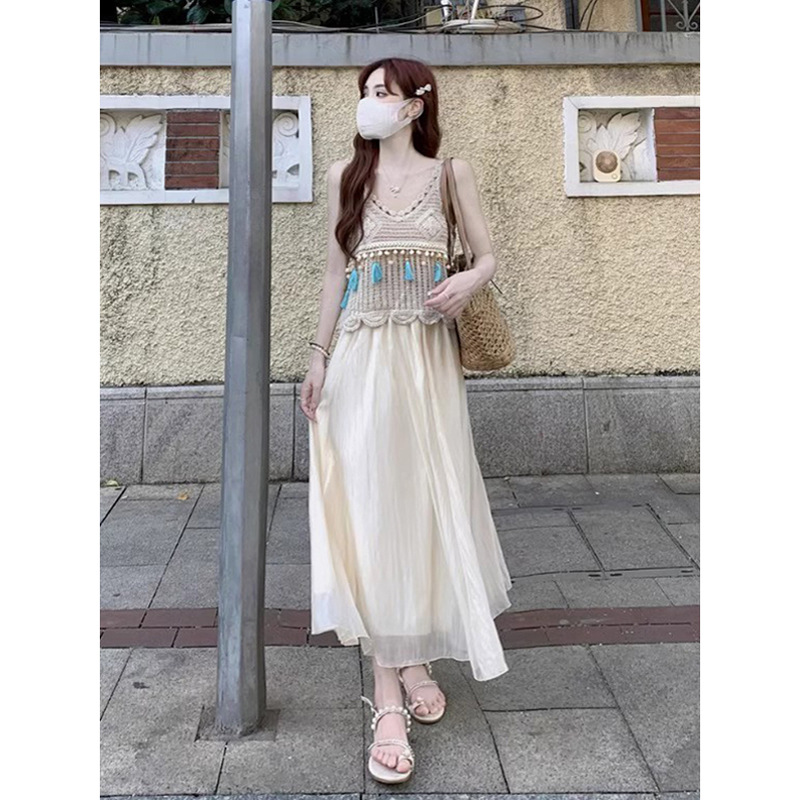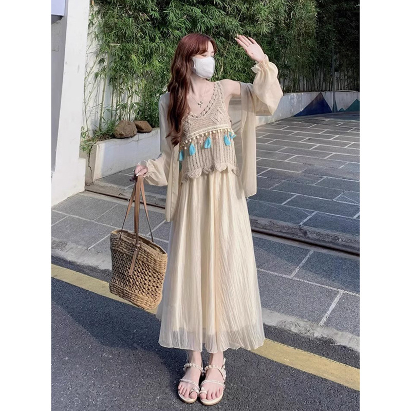 旅游穿搭民族风海边度假连衣裙套装女夏季超仙温柔吊带开衫三件套