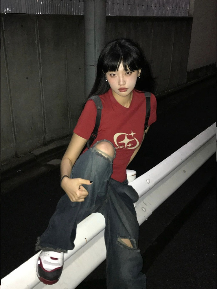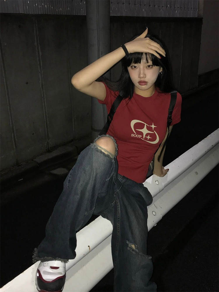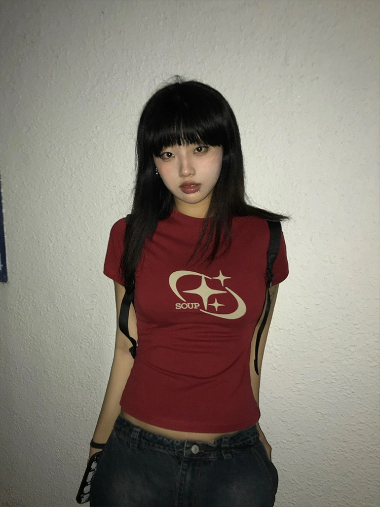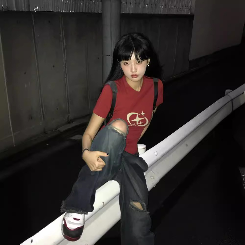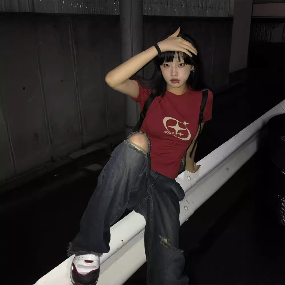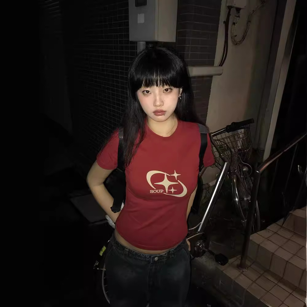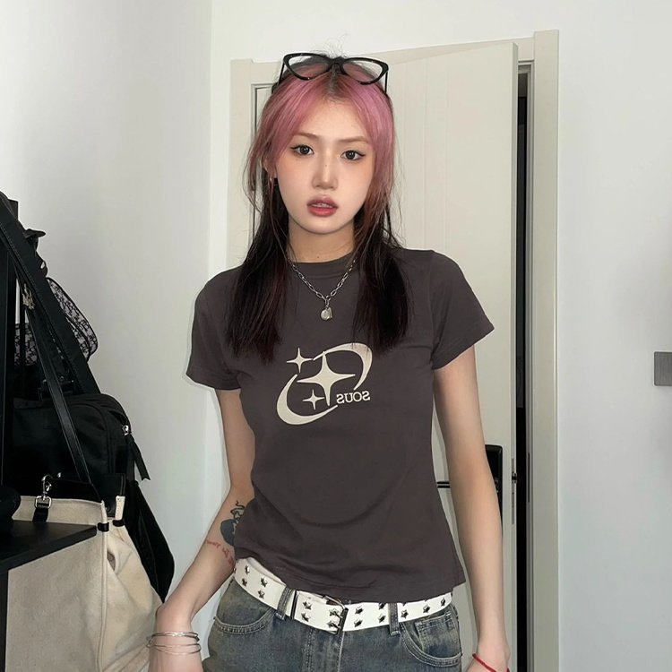 100%纯棉美式复古修身短袖女夏季辣妹正肩t恤显瘦短款上衣潮