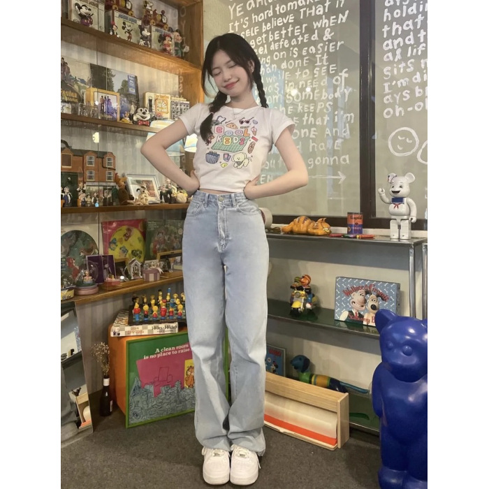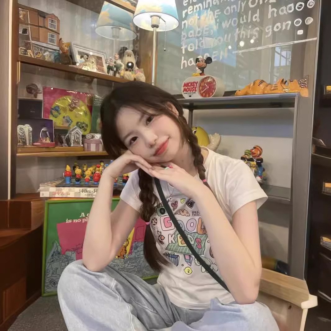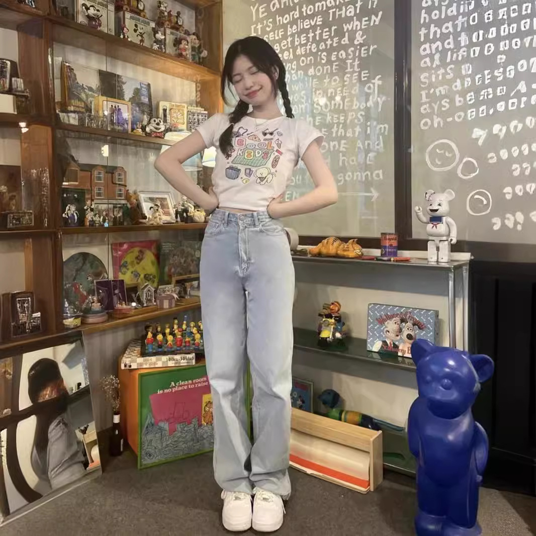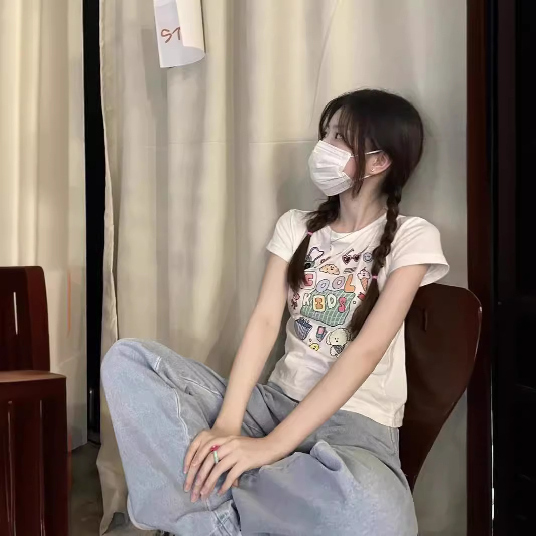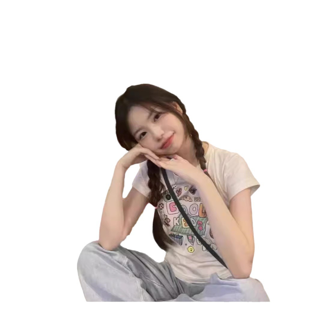 夏季甜酷风短袖t恤女新款卡通印花白色正肩修身显瘦短款上衣
