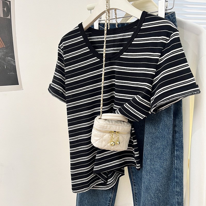 条纹U领短袖t恤女春夏新款宽松韩版百搭休闲v领慵懒松弛上衣