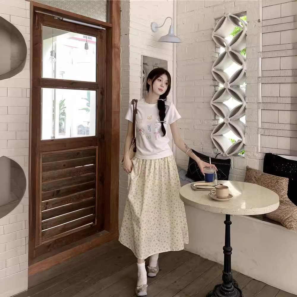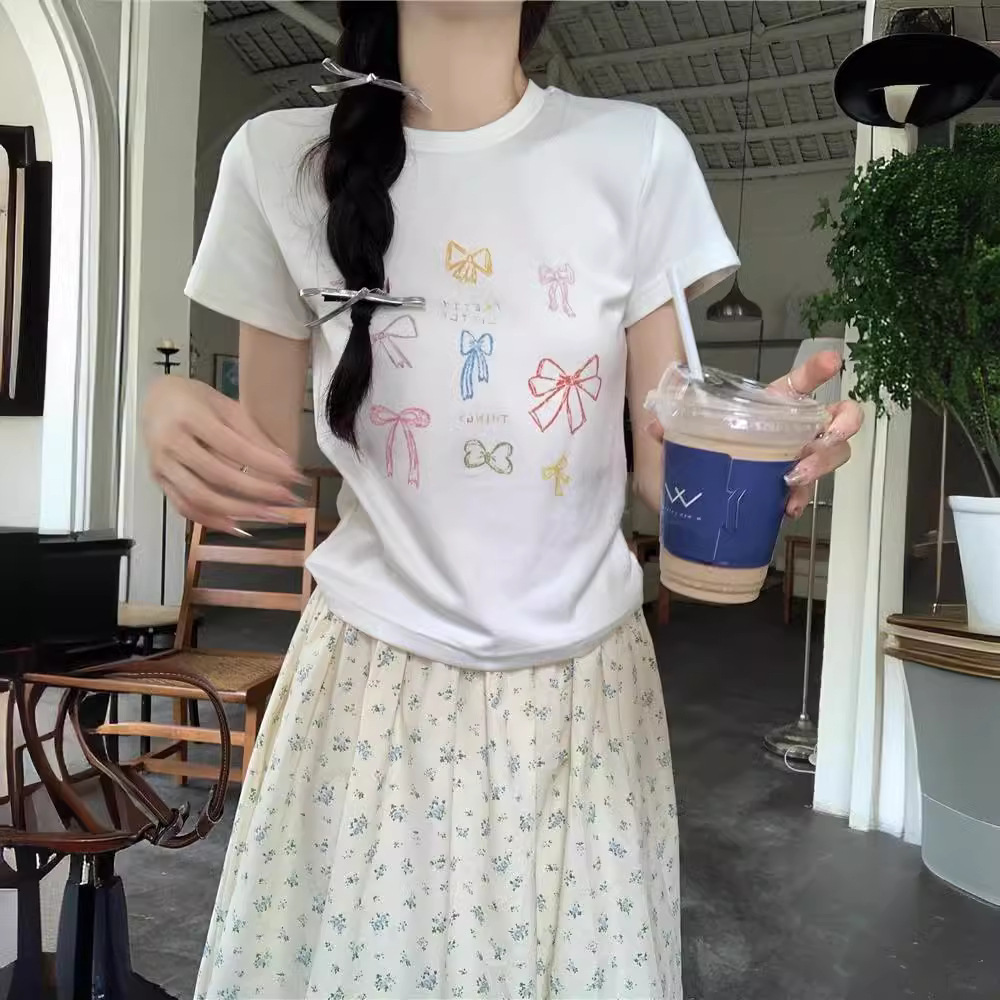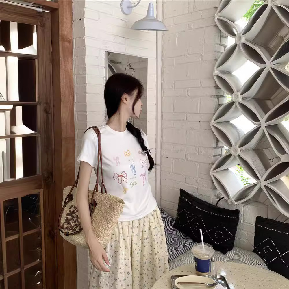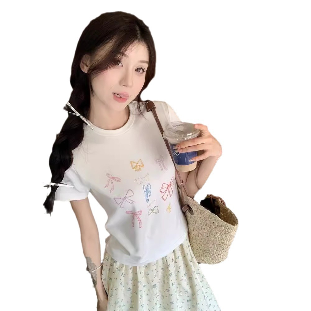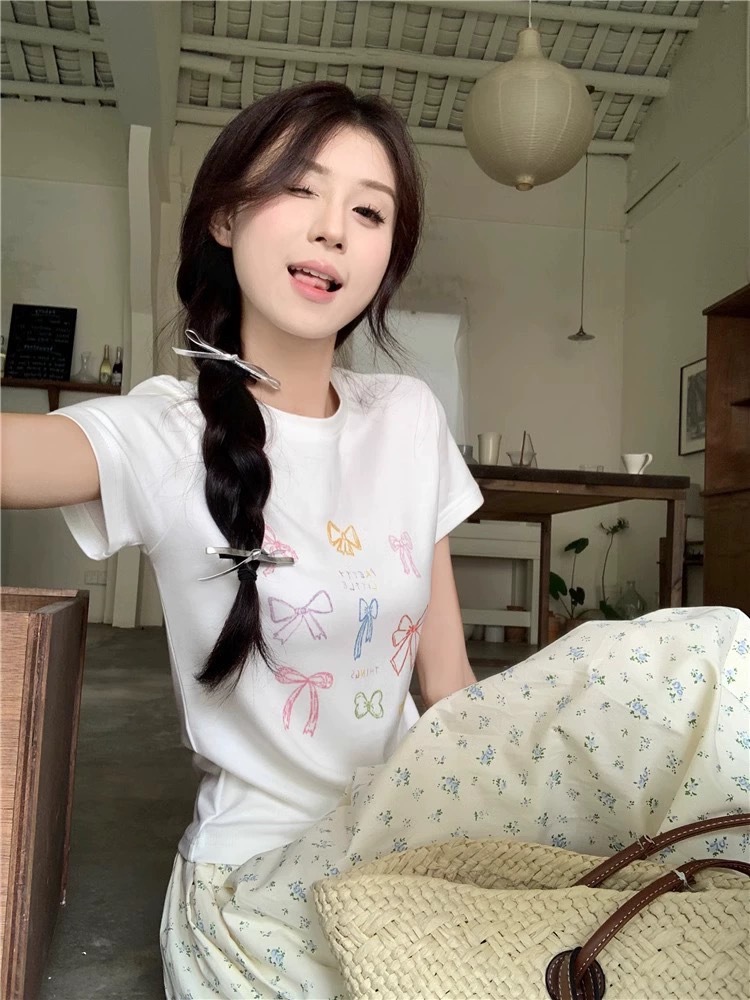 韩系甜辣风蝴蝶解印花T恤修身显瘦短袖内搭女春夏季圆领短款上衣