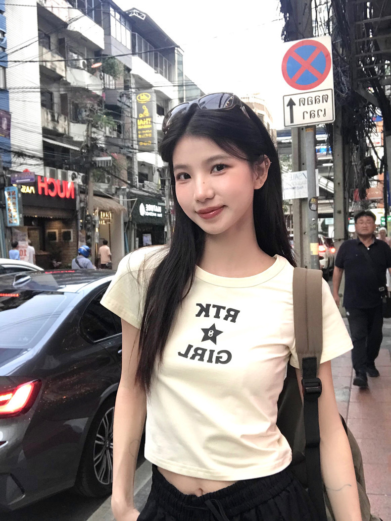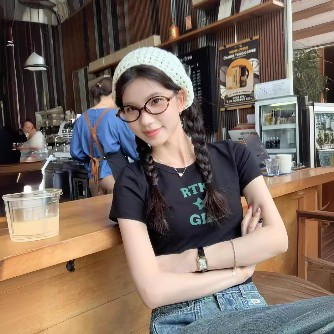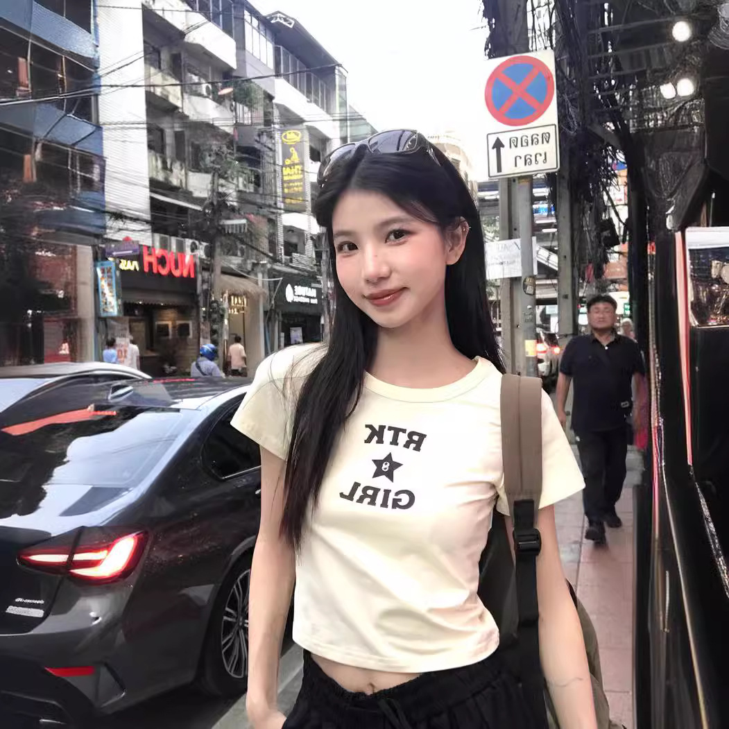 美式复古修身显瘦正肩短袖t恤女夏日多巴胺穿搭辣妹小众短款上衣