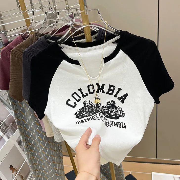 撞色印花美式复古v领短袖t恤女修身短款露脐辣妹夏季独特别致上衣