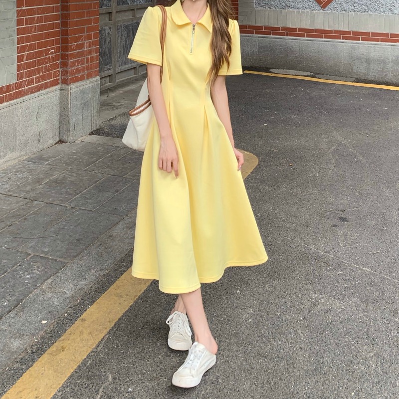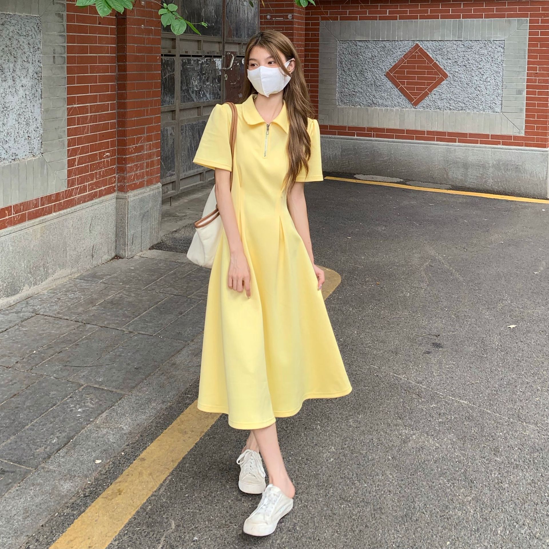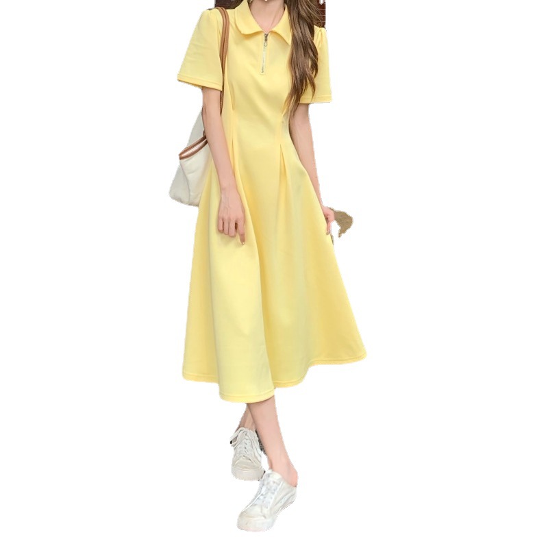 休闲大码法式polo领拉链连衣裙女新款夏季胖mm收腰遮肚长裙潮