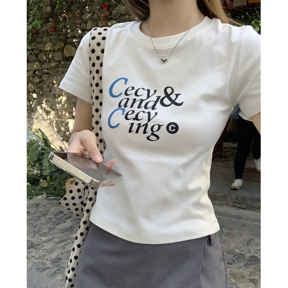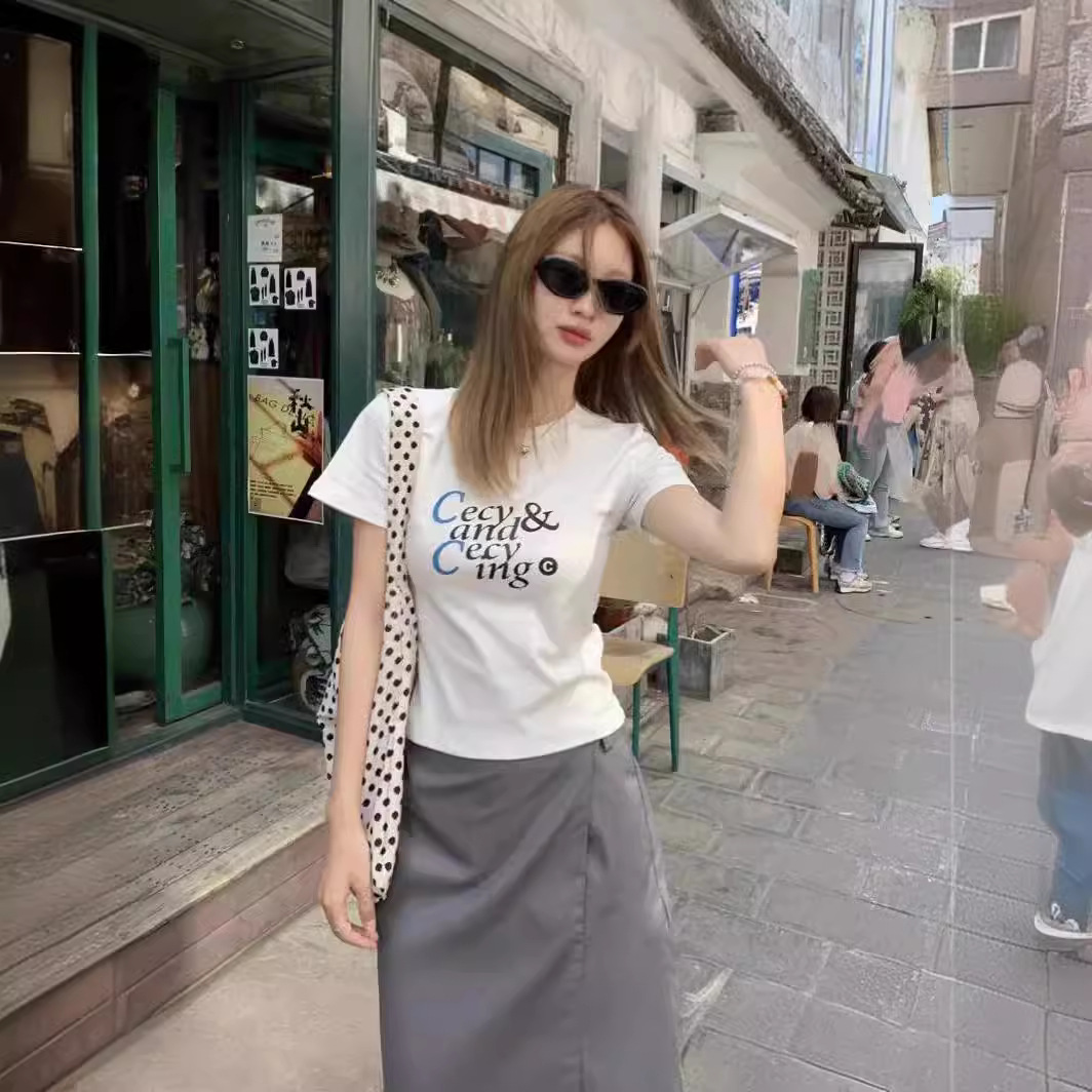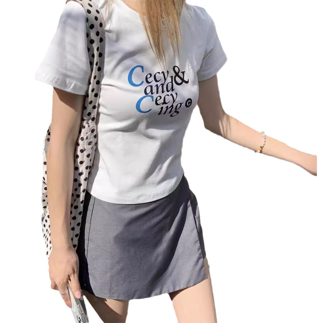 爆款字母印花正肩辣妹短袖夏季显瘦美式复古新款T恤修身百搭上衣