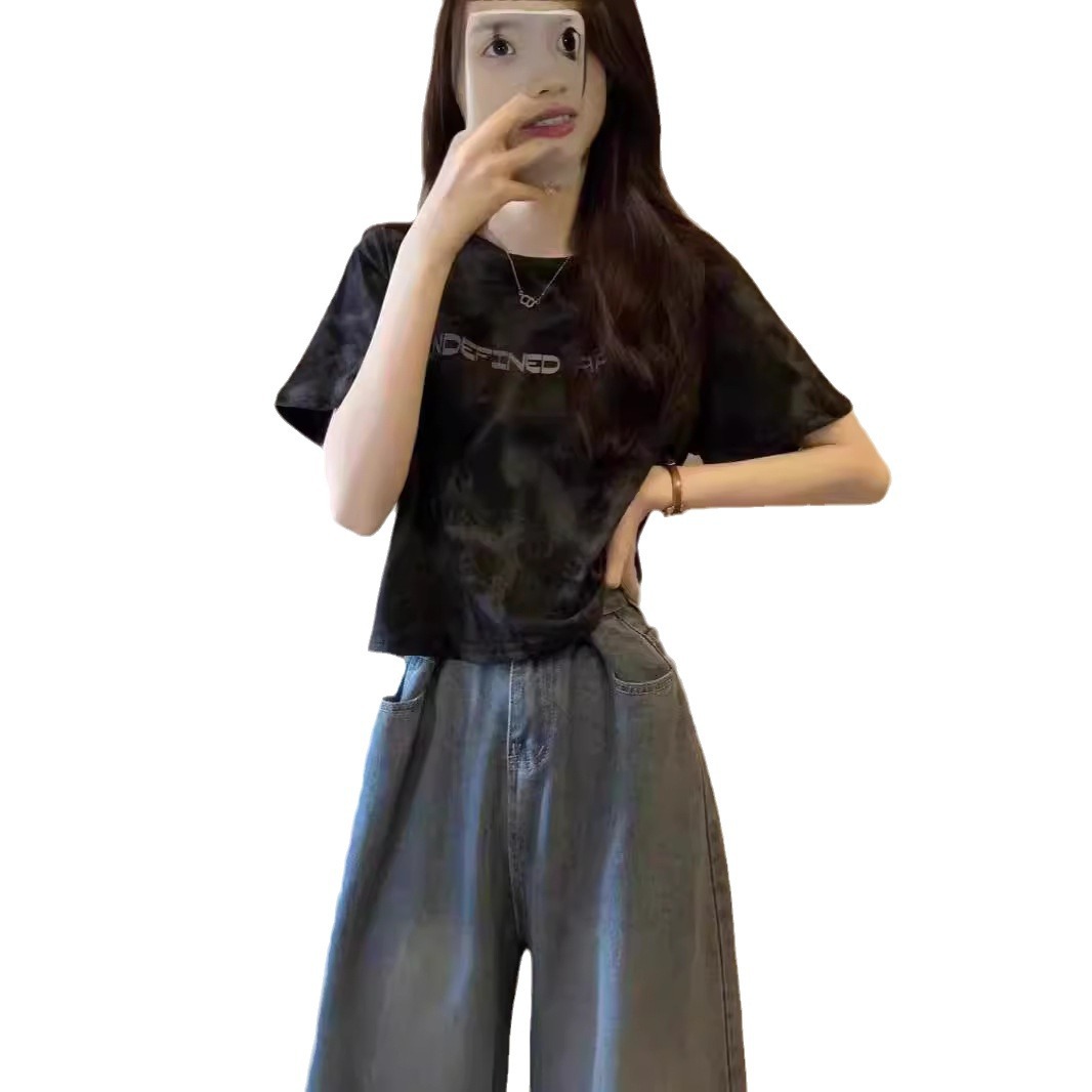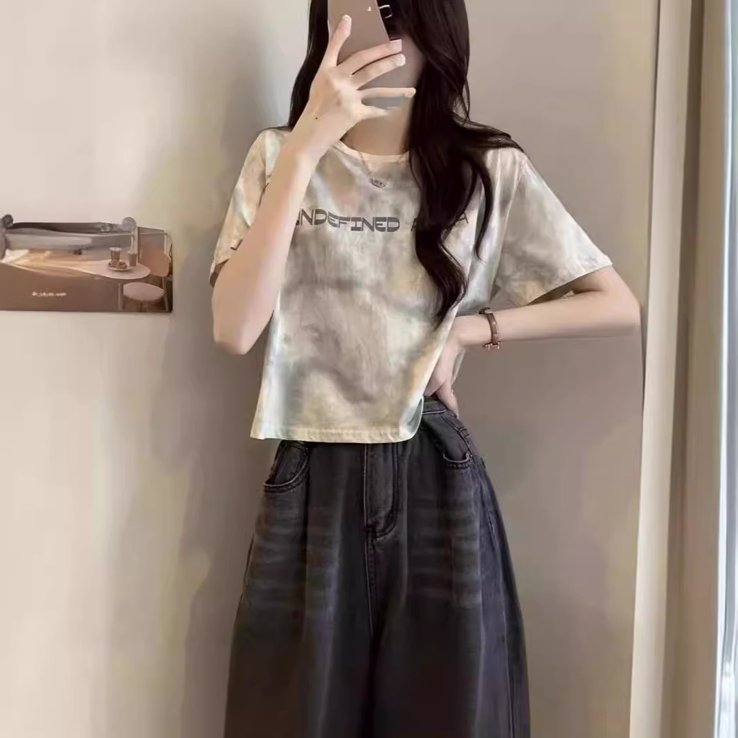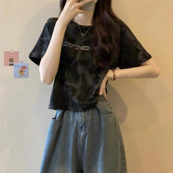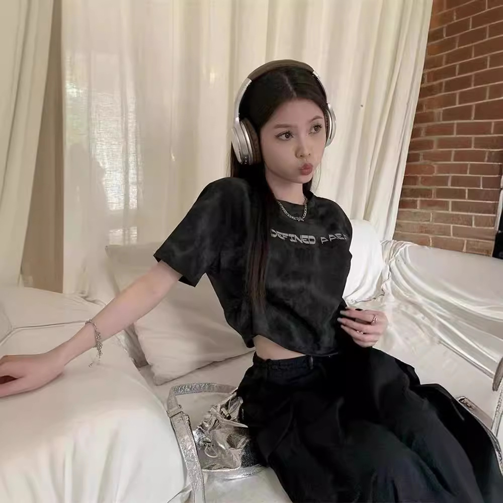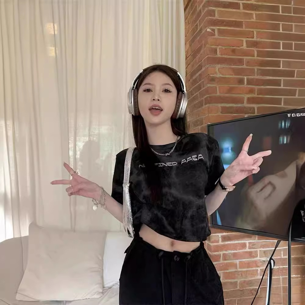 美式甜辣bm风上衣夏季新款设计感小众纯棉短款正肩T恤女扎染短袖
