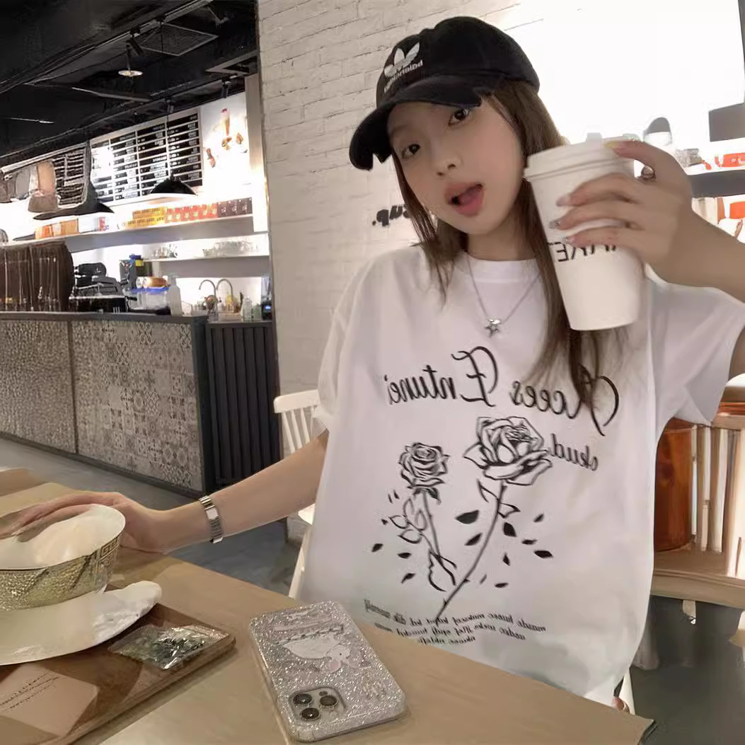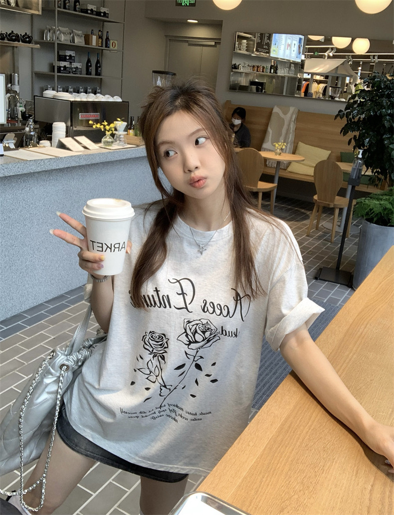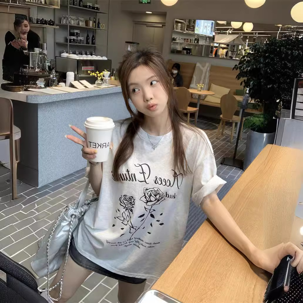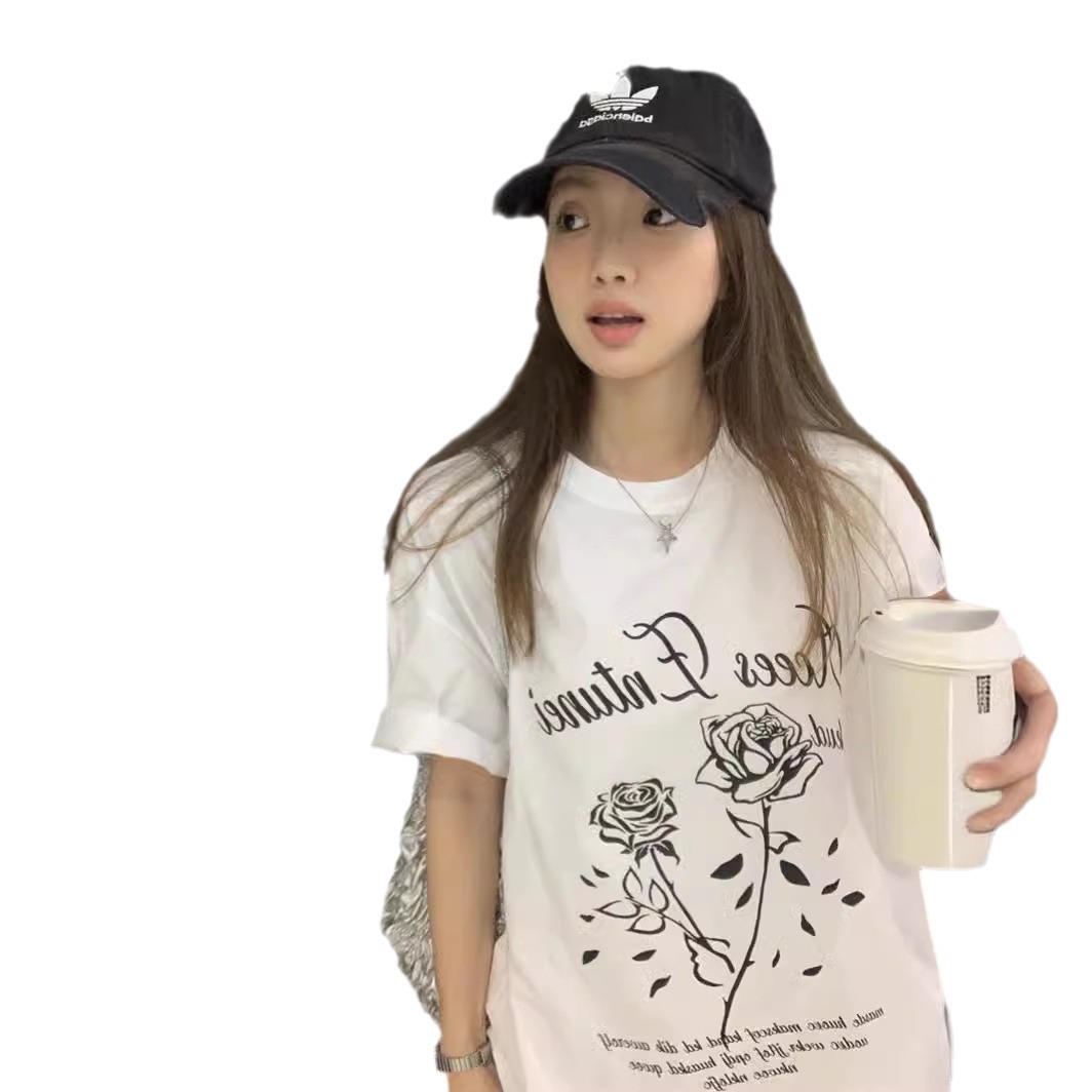 美式复古玫瑰印花短袖T恤女夏季气质宽松休闲百搭慵懒风圆领上衣