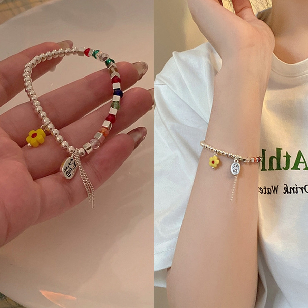 S925银招财花朵圆珠手链彩色水晶串珠手环时尚潮流个性手工手饰潮
