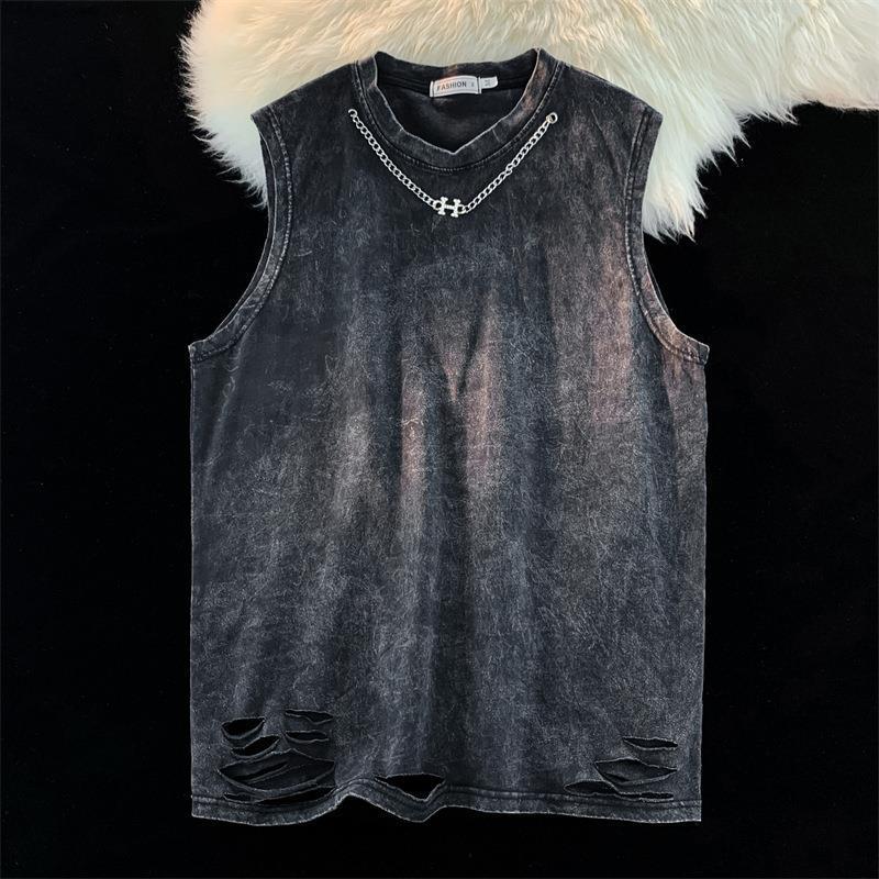水洗做旧无袖t恤男夏季港风ins个性宽松嘻哈休闲坎肩潮牌背心体恤