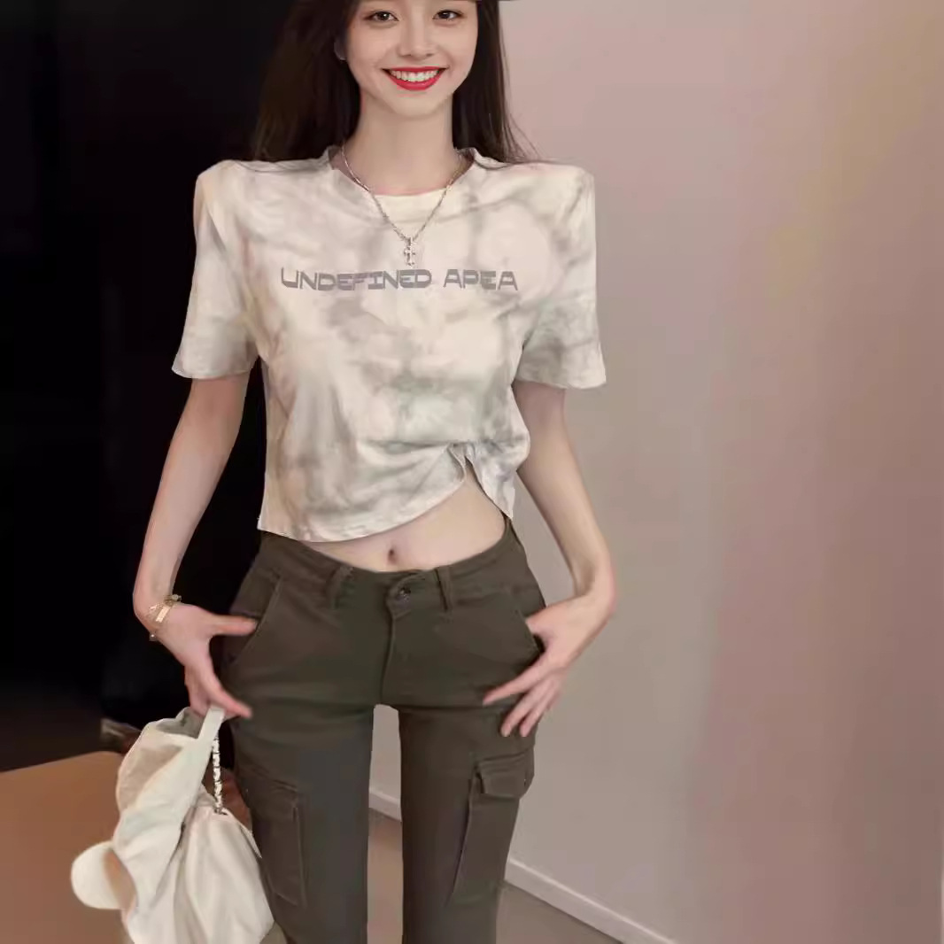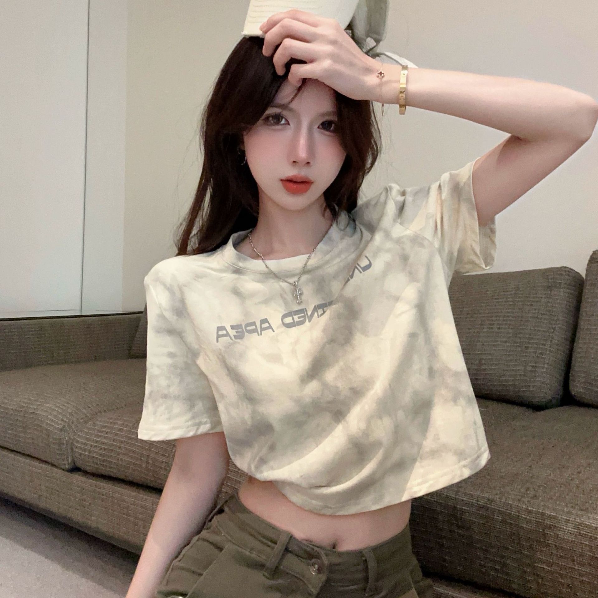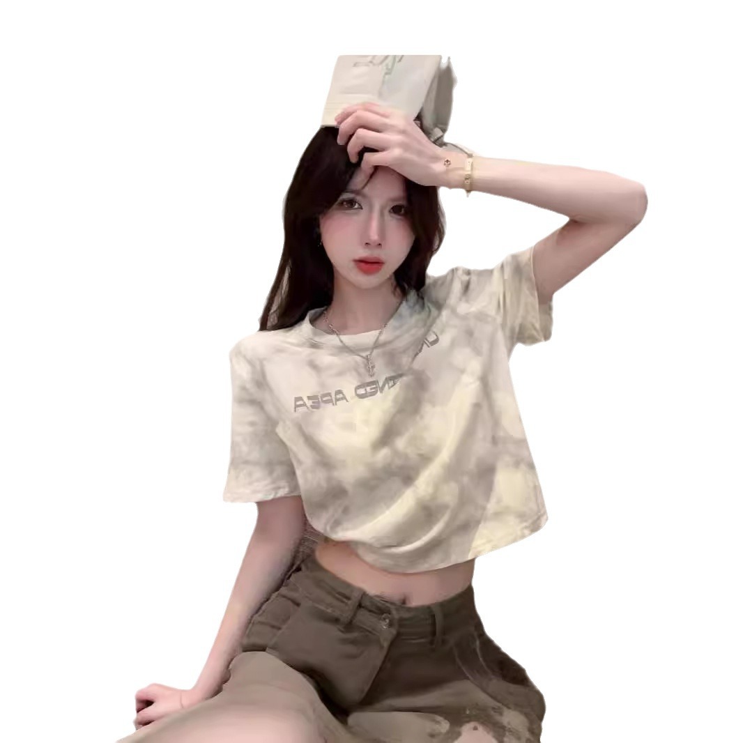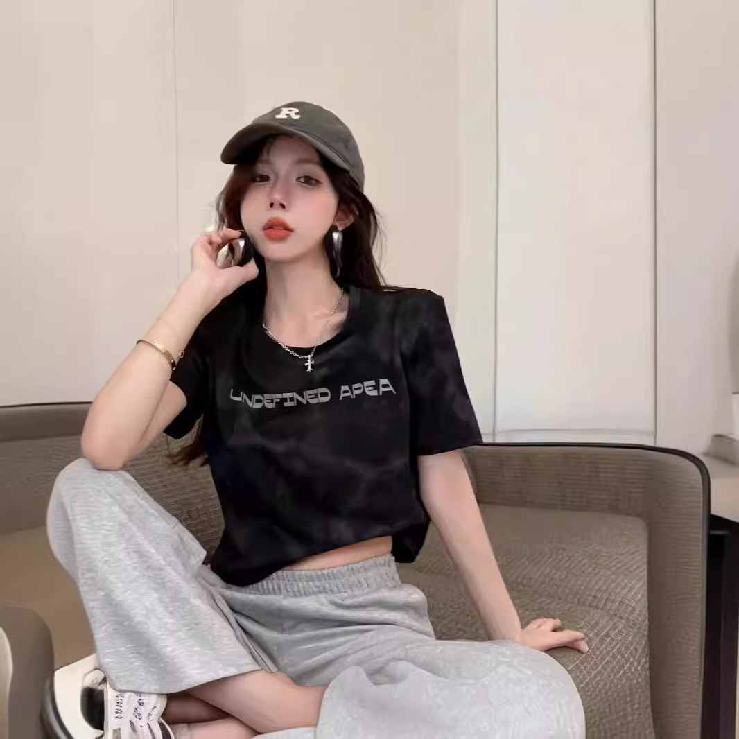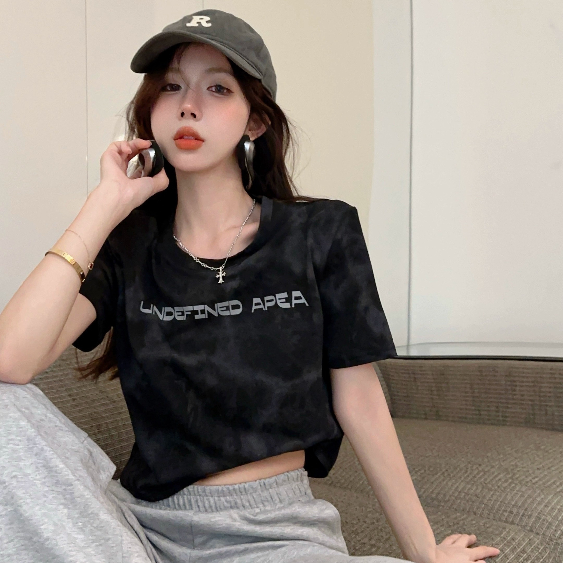 美式甜辣bm风上衣夏季新款设计感小众纯棉短款正肩T恤女扎染短袖