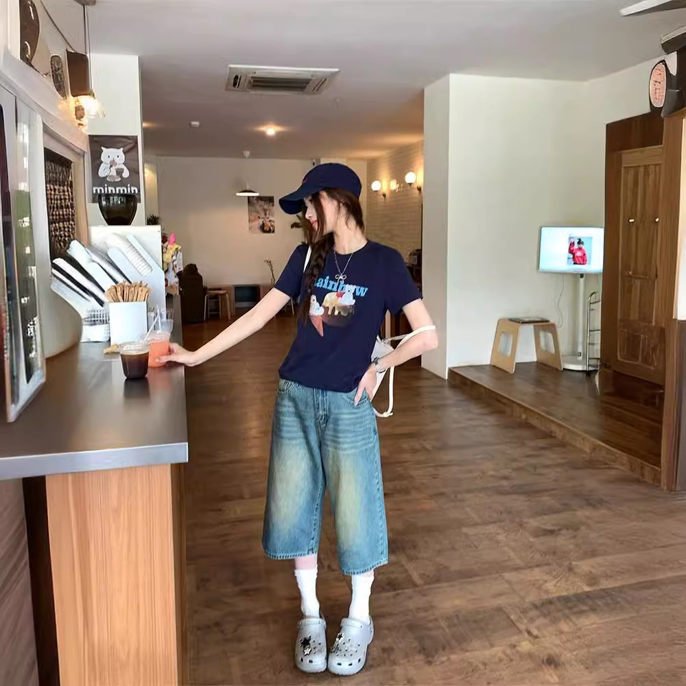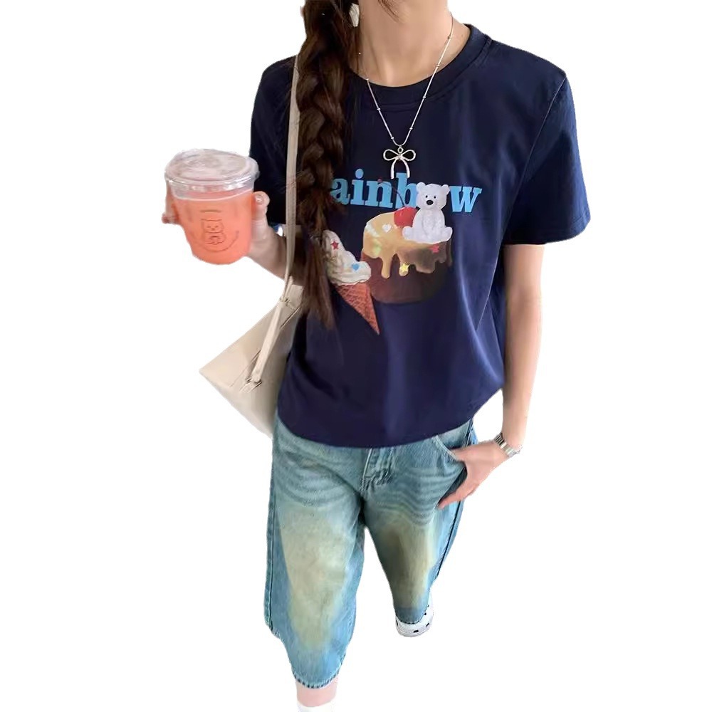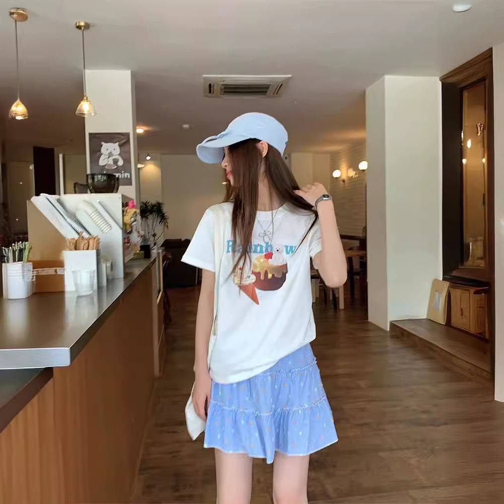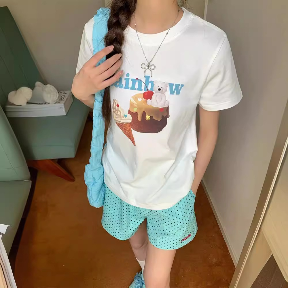 韩系蛋糕冰淇淋印花正肩T恤夏季新款宽松圆领字母短袖tee女