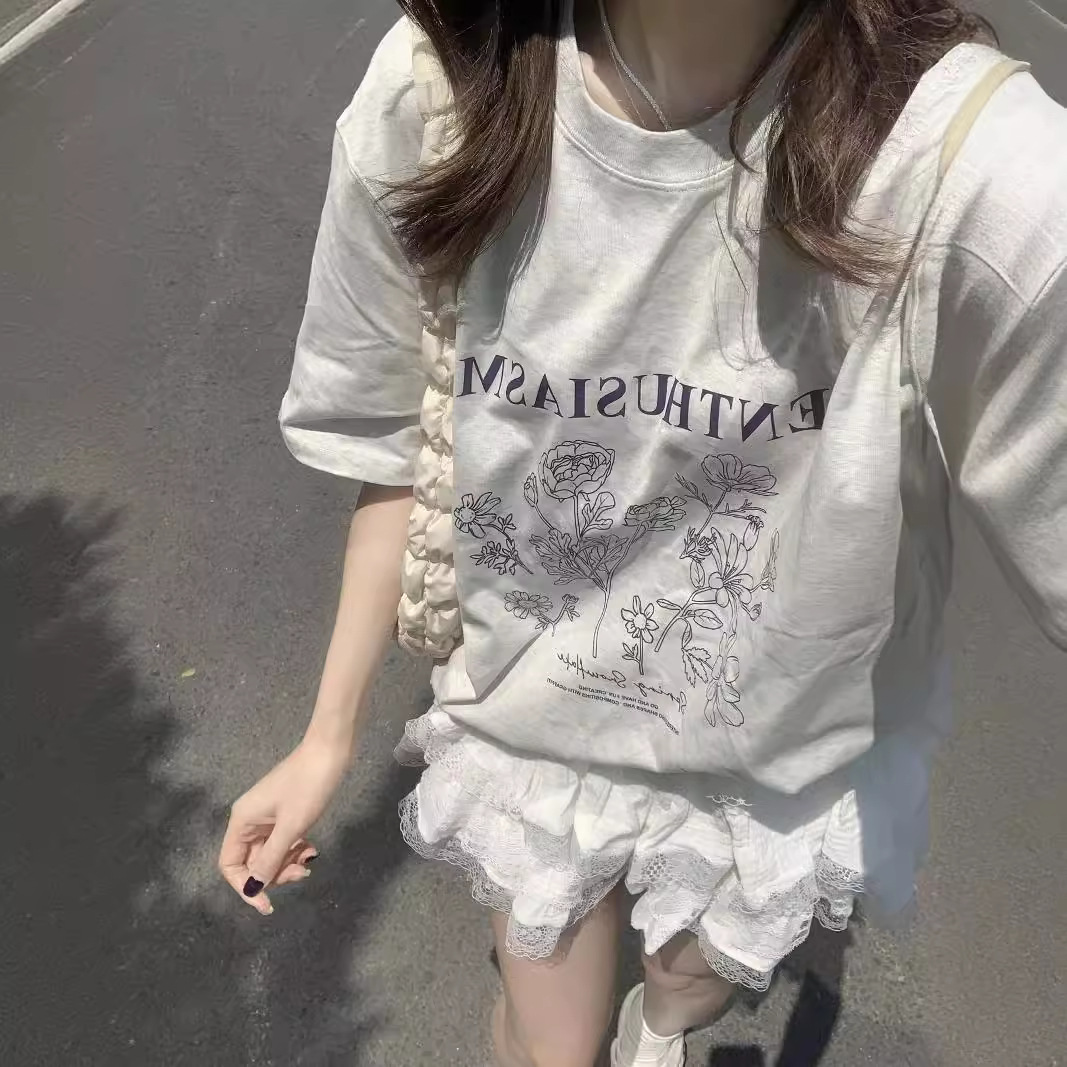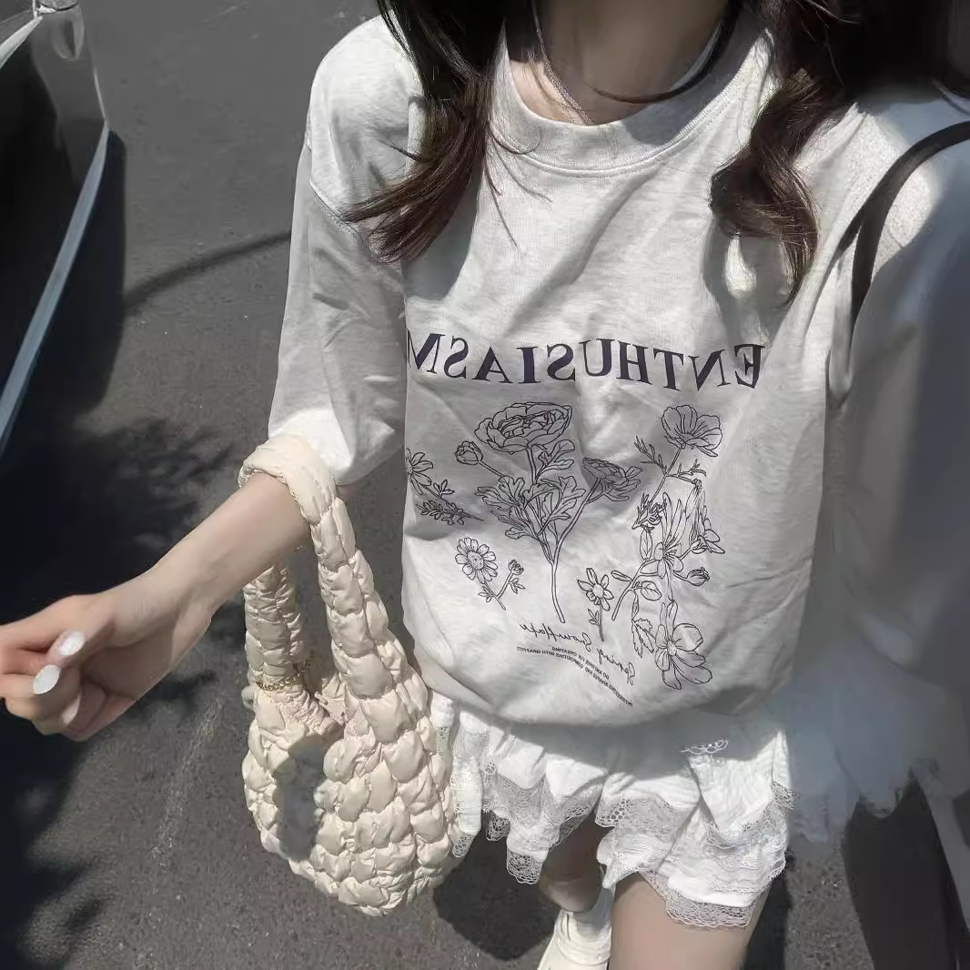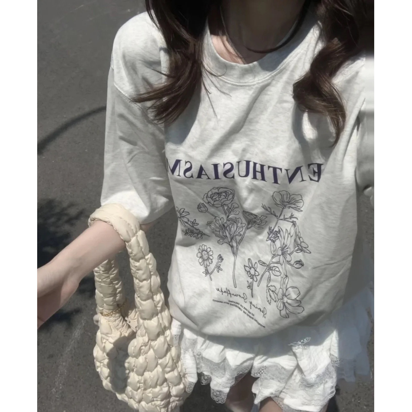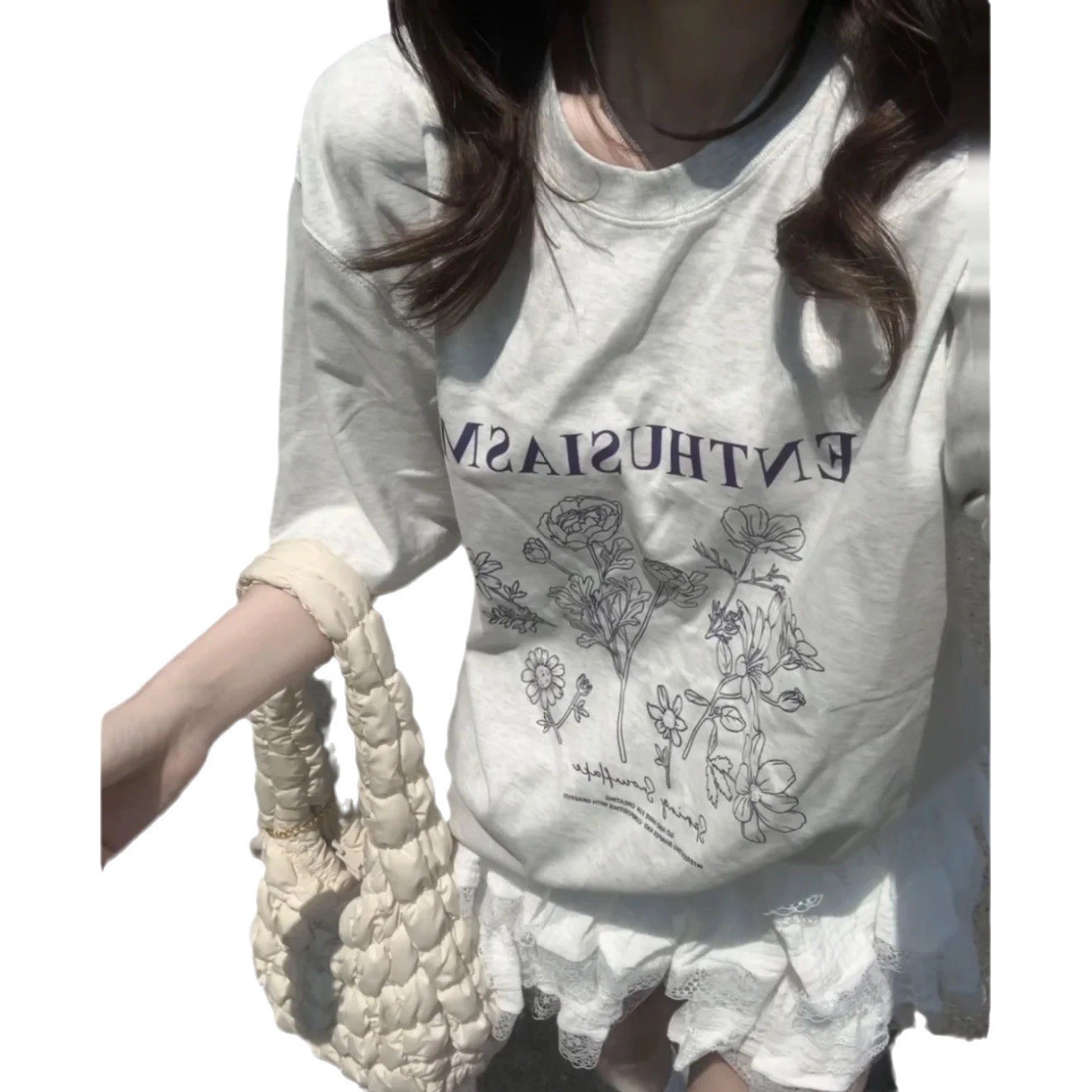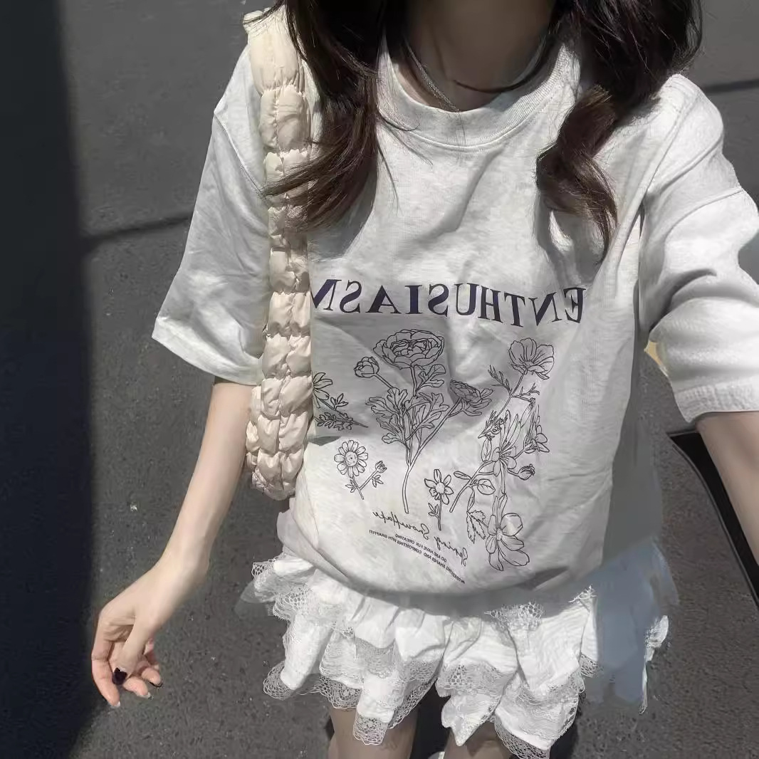 韩系甜美白灰色短袖T恤女夏季新款oversize纯棉宽松半袖上衣