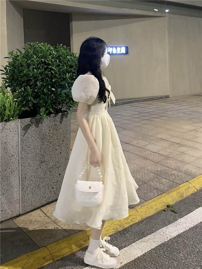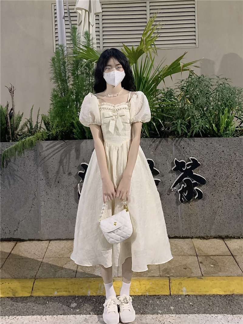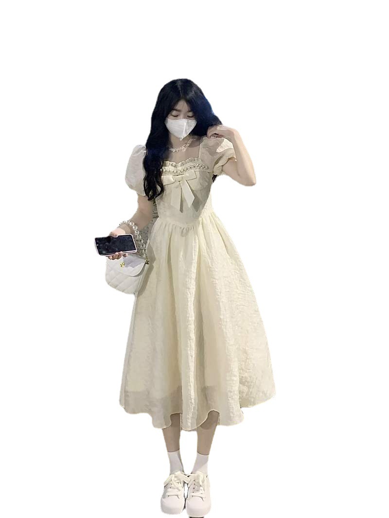 夏季连衣裙女甜美可爱泡泡袖长公主裙子蝴蝶结法式小众设计感衣裙