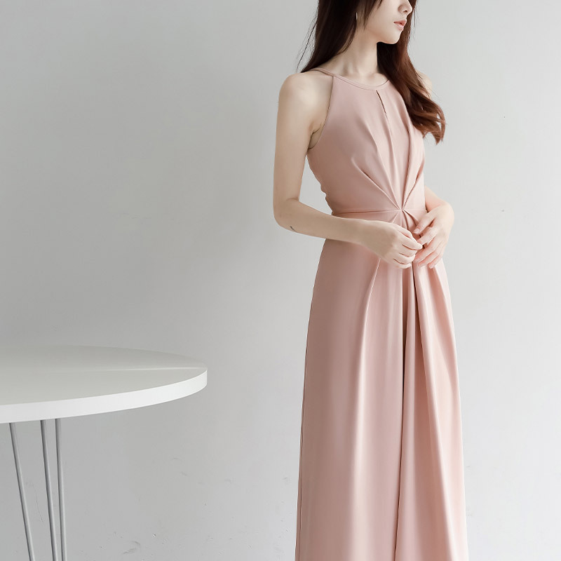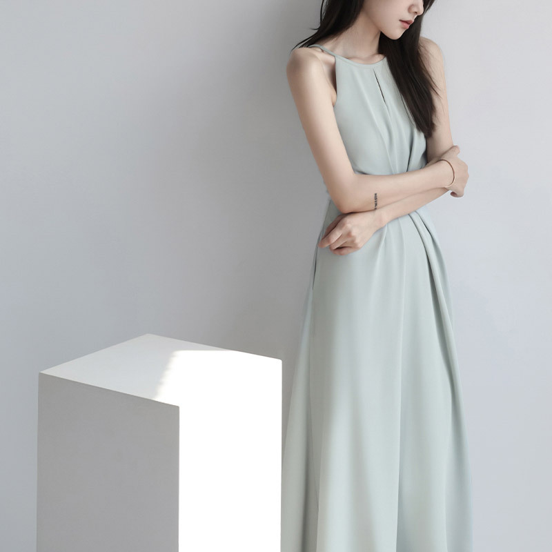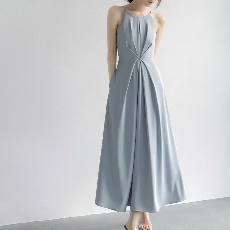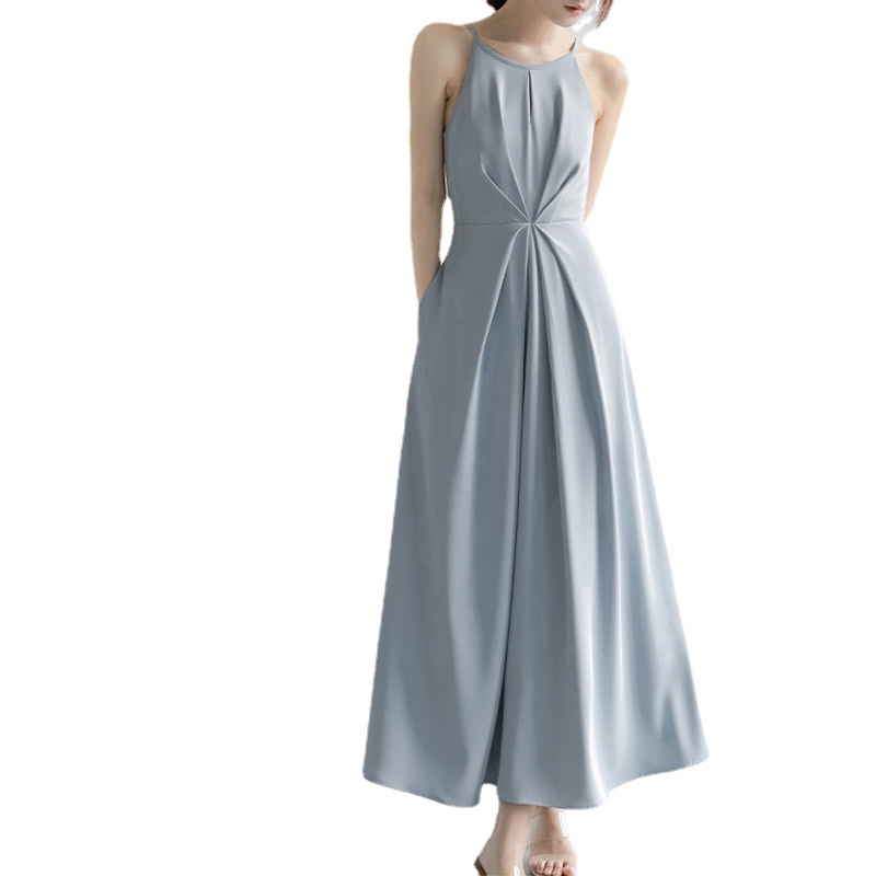高定法式吊带连衣裙夏季新款露肩垂坠抗皱休闲长裙气质仙女裙
