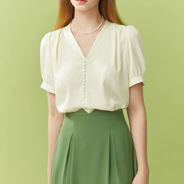 高级质感夏女新款V领短袖衬衫小众时尚薄款气质职业上衣