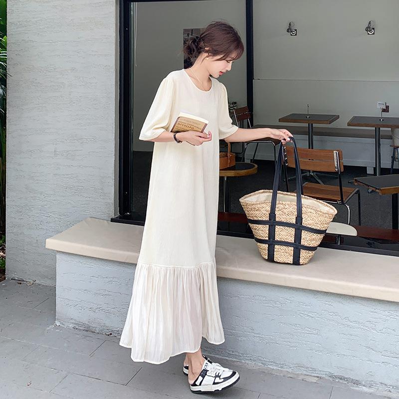 实拍气质米杏色肌理感宽松圆领chic显瘦拼接鱼尾裙摆优雅风连衣裙