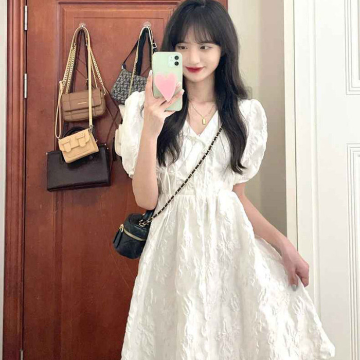 公主蓬蓬连衣裙女夏季泡泡袖V领小众设计高级感别致漂亮独特裙子