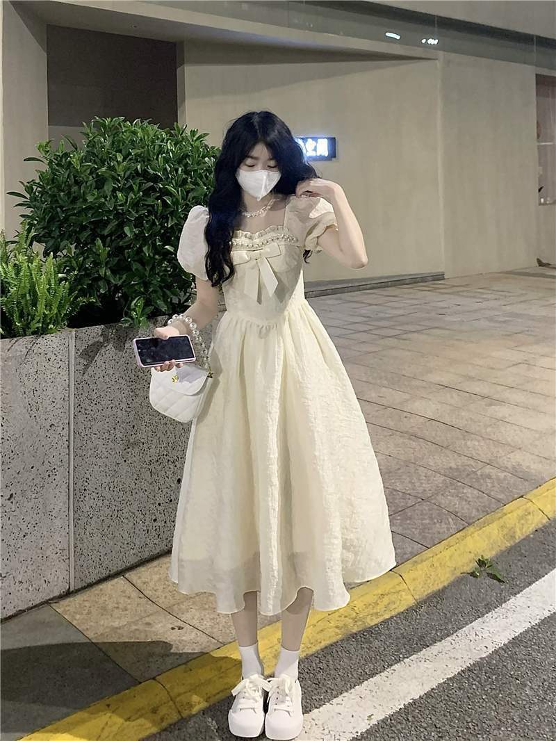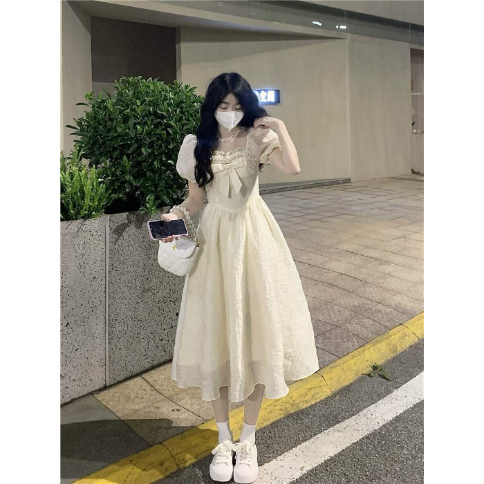 甜美初恋连衣裙女新款夏季气质蝴蝶结收腰显白公主裙过膝长裙