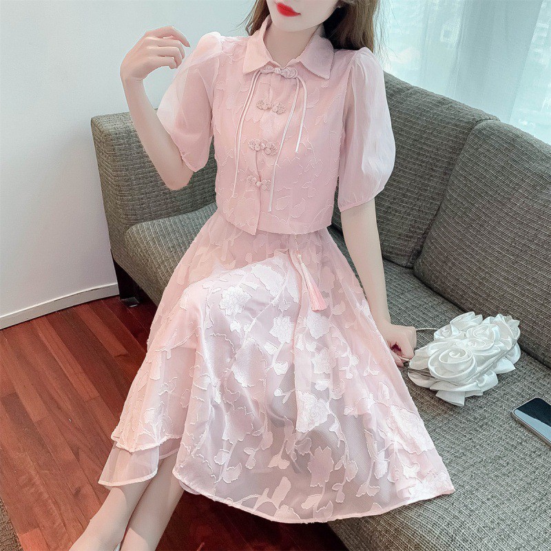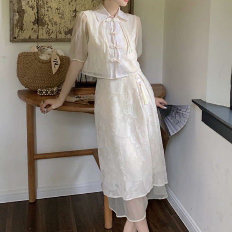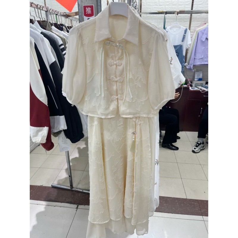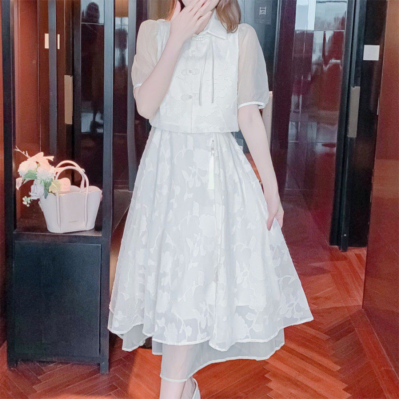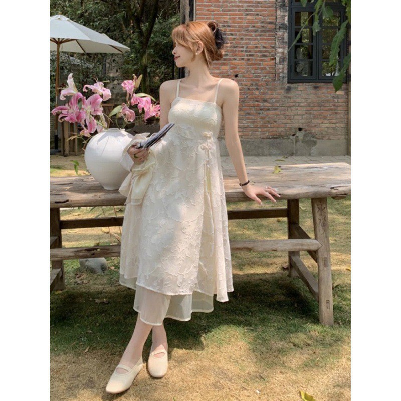 新中式两件套裙装年夏季新款改良旗袍连衣裙收腰显瘦吊带过膝