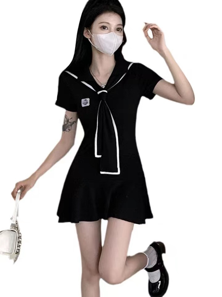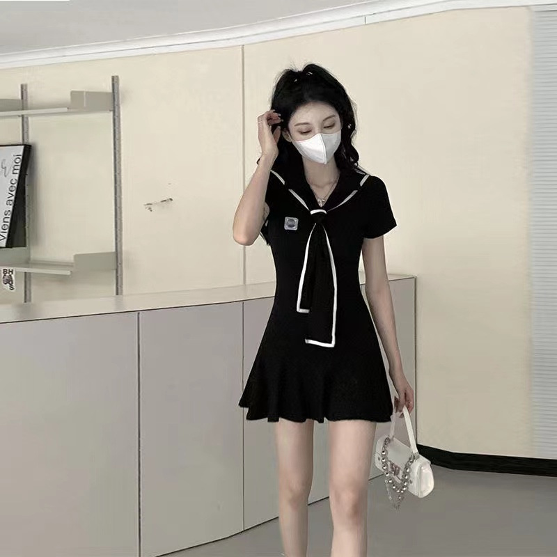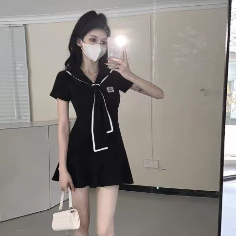 夏季学院风海军领披肩领带连衣裙女纯欲甜辣妹荷叶边少女裙子