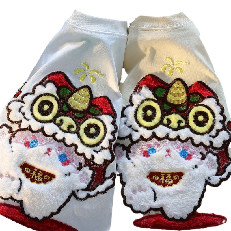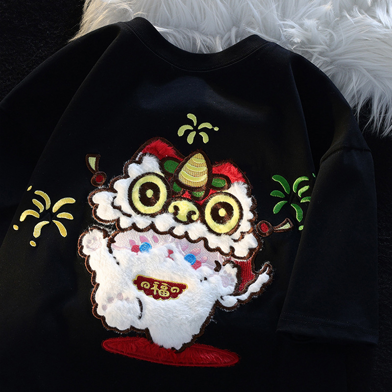 纯棉国潮毛绒刺绣小猫植绒夏季短袖T恤男女美式宽松情侣休闲上衣