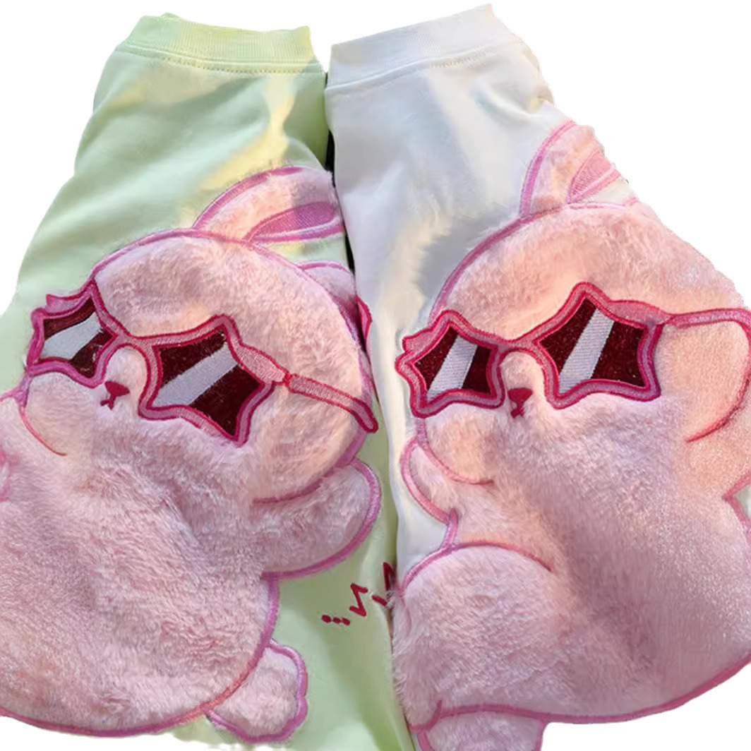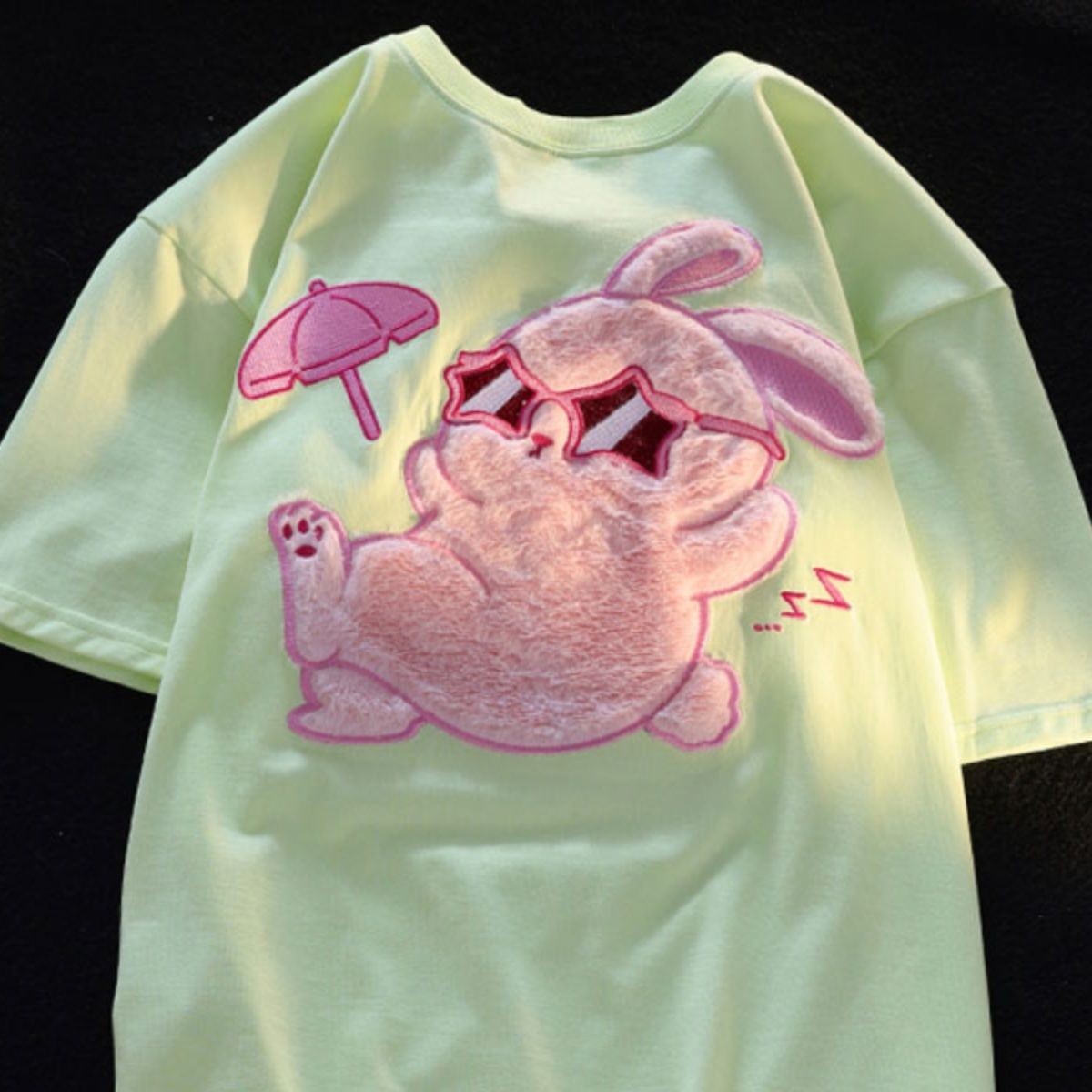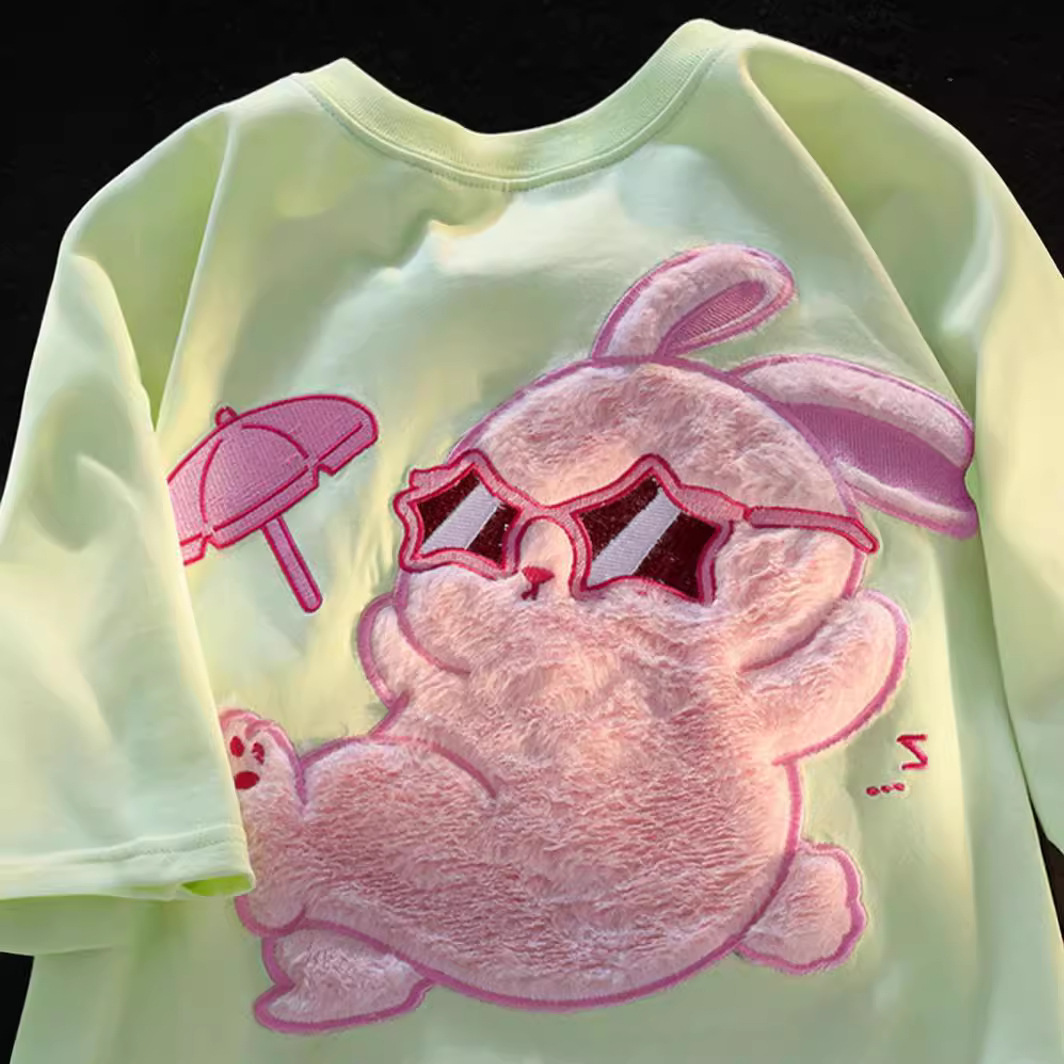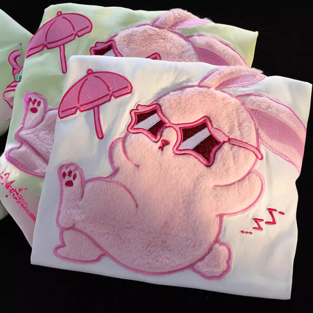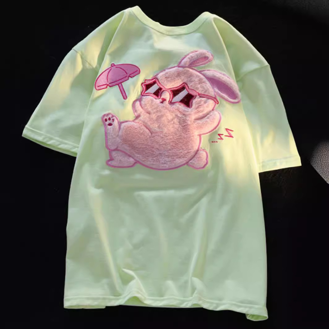 甜美可爱纯棉植绒小兔子短袖男女夏季新款情侣宽松百搭上衣T恤潮
