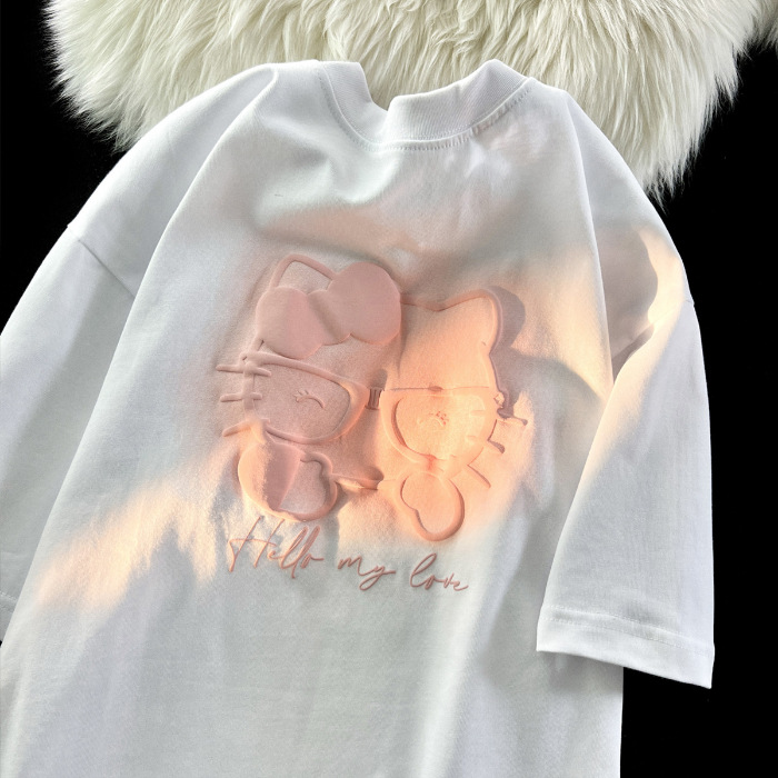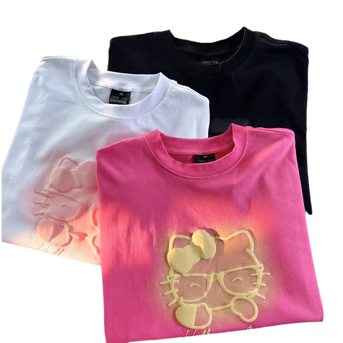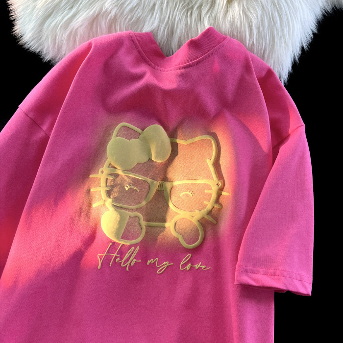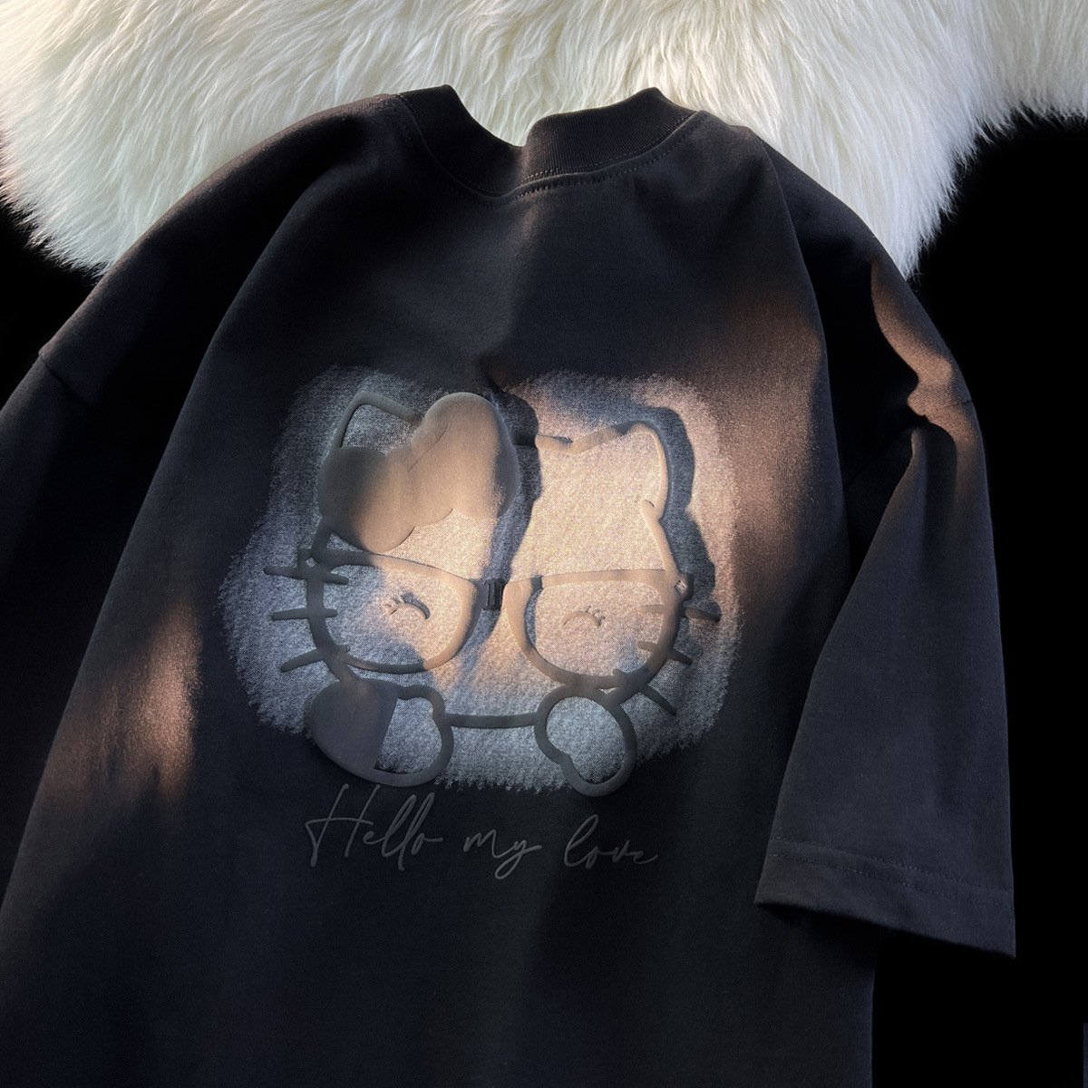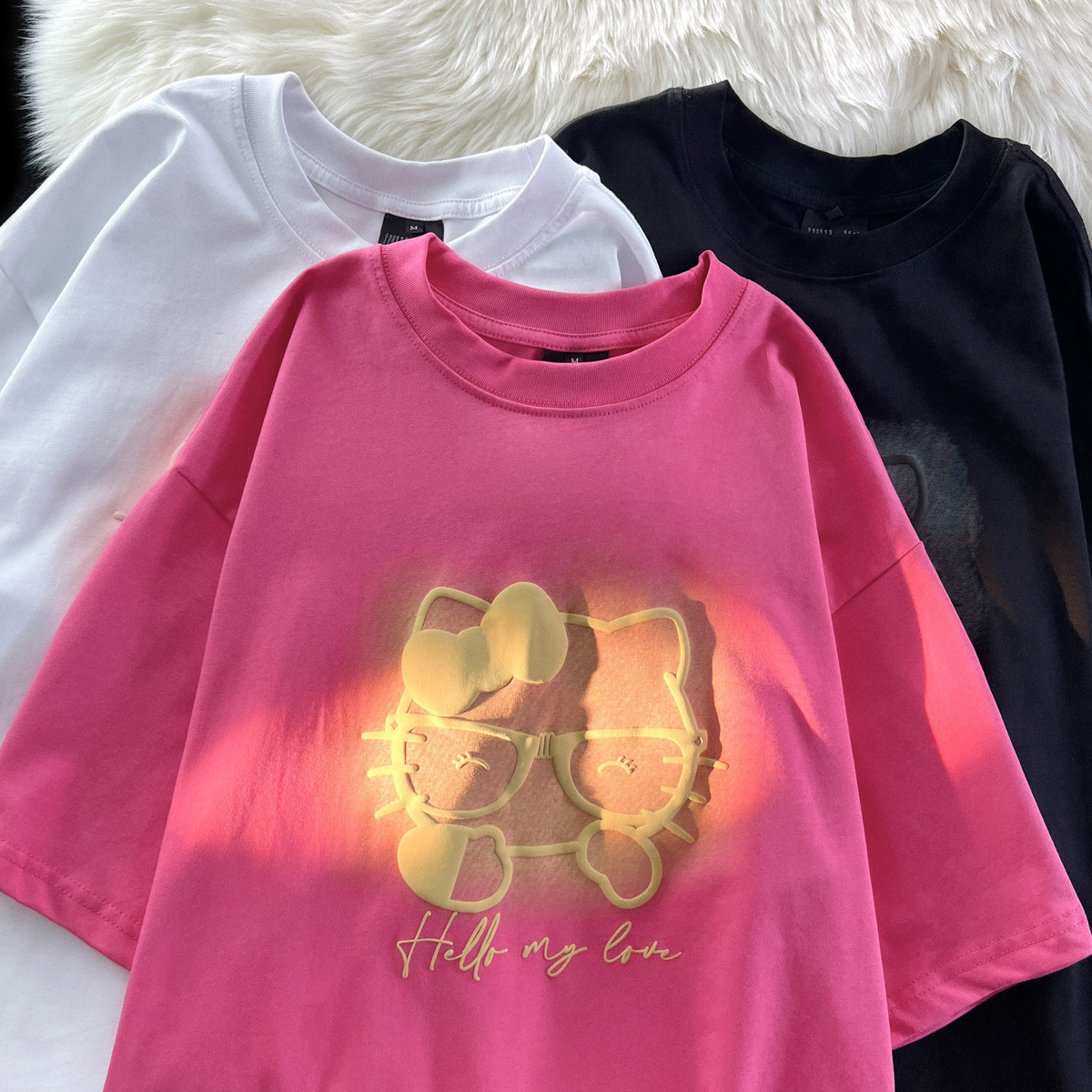 100%纯棉美式复古kitty猫短袖t恤女春夏季宽松设计感小众上衣