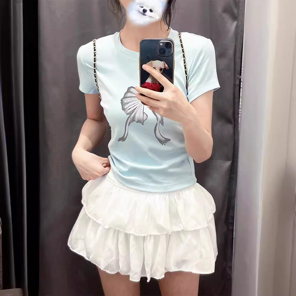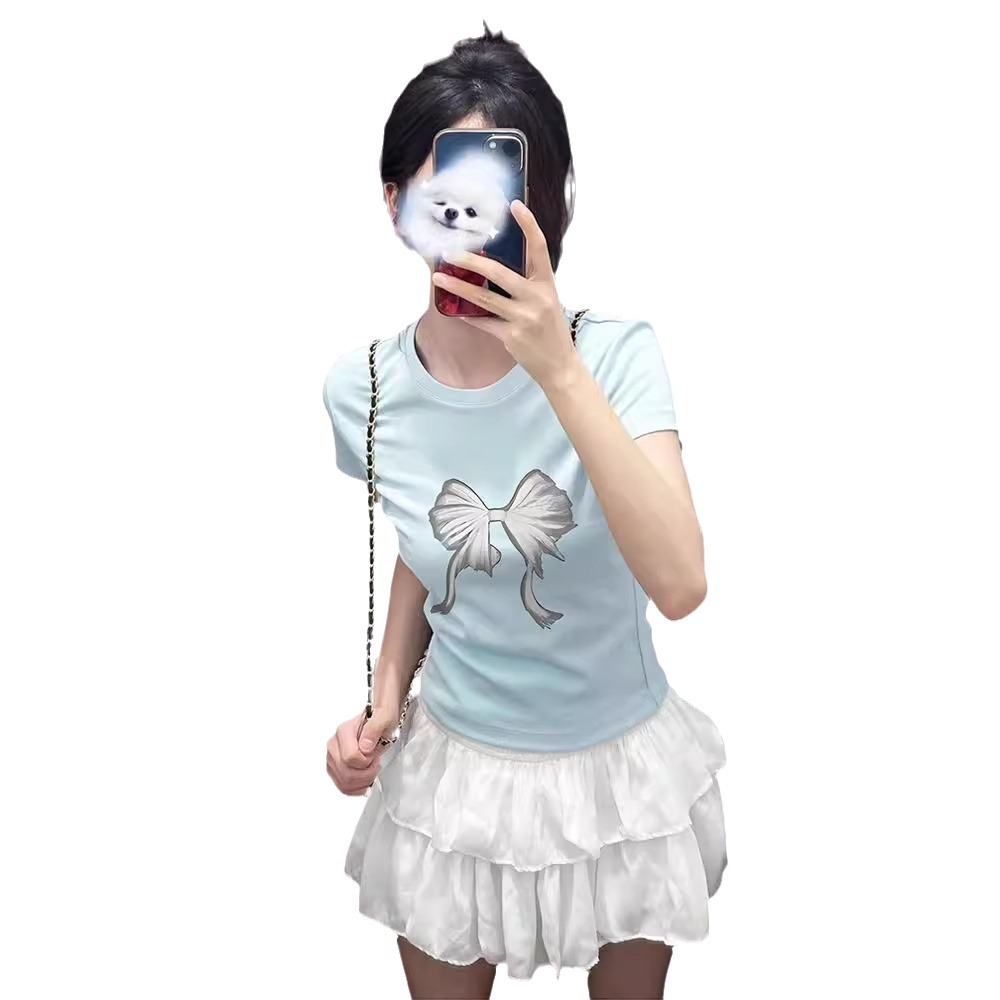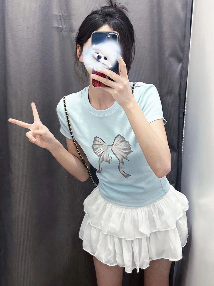 重磅纯棉蓝色修身短款t恤女美式正肩蝴蝶多巴胺纯欲风辣妹上衣夏